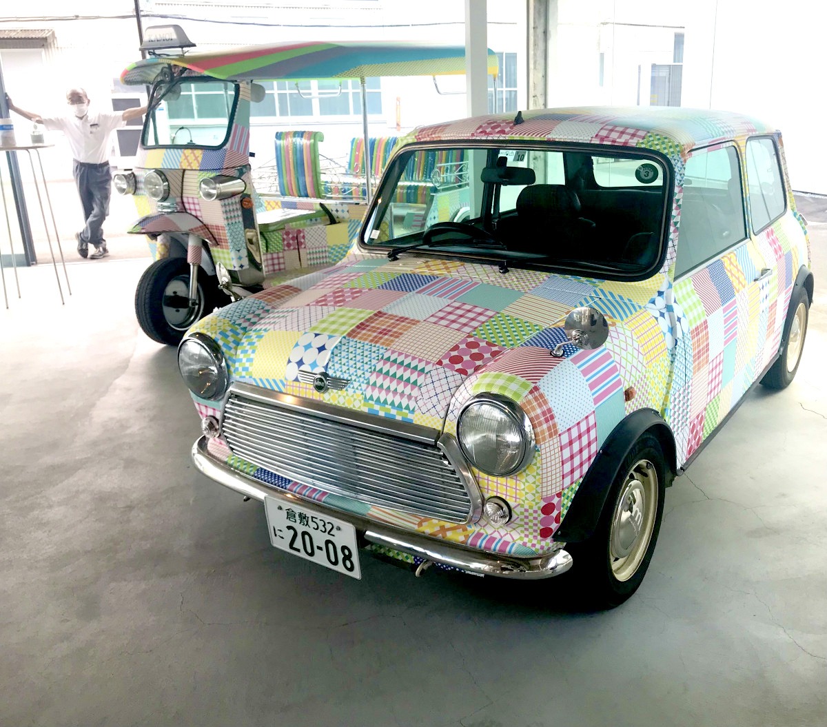ガラス張りの1Fを入ると、「mt」で彩られたヴィンテージカーがお出迎え。