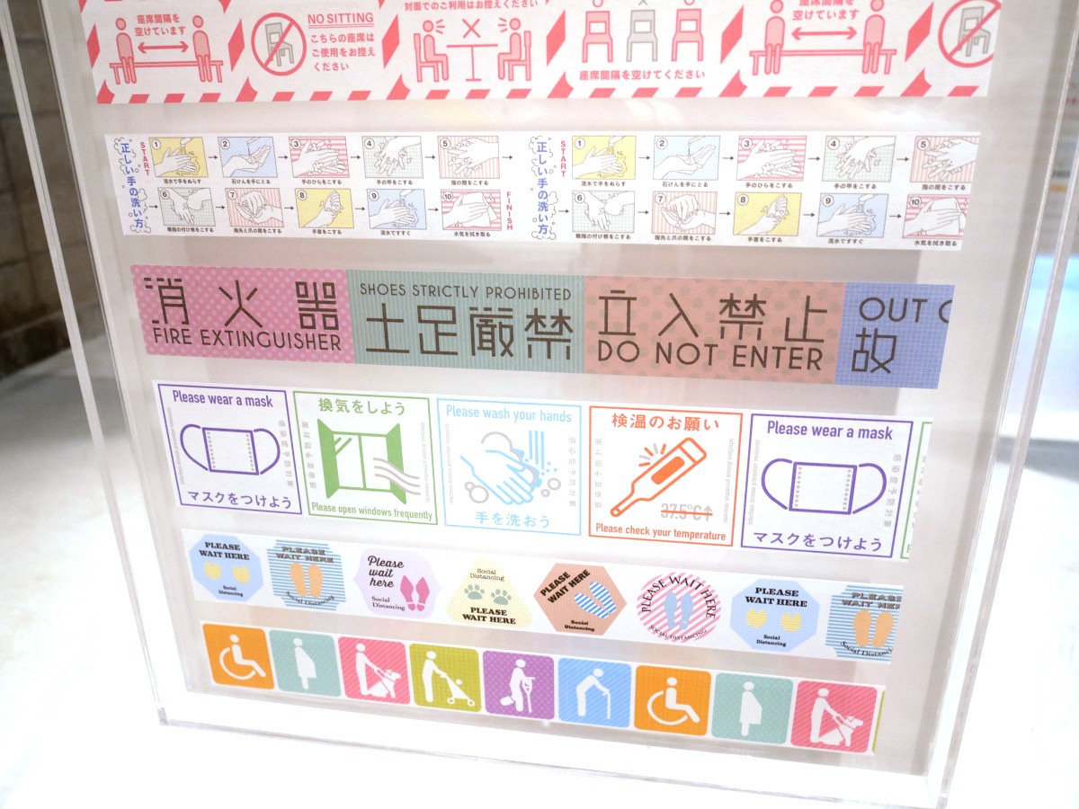 「マスクをつけよう」「正しい手の洗い方」「間隔をあけて」など、時勢を反映した「mt」もたくさん。これまでに期間/地域限定で販売されたり、行事やテーマごとに作られた、今では買えない貴重なmtもたくさんのアクリル板に展示されています。「mt」デザインは和食文化、惑星、珈琲器具、お寿司、日本各地の観光地など多岐に渡り、じっくり見ていくと時間を忘れるほど惹きこまれました。