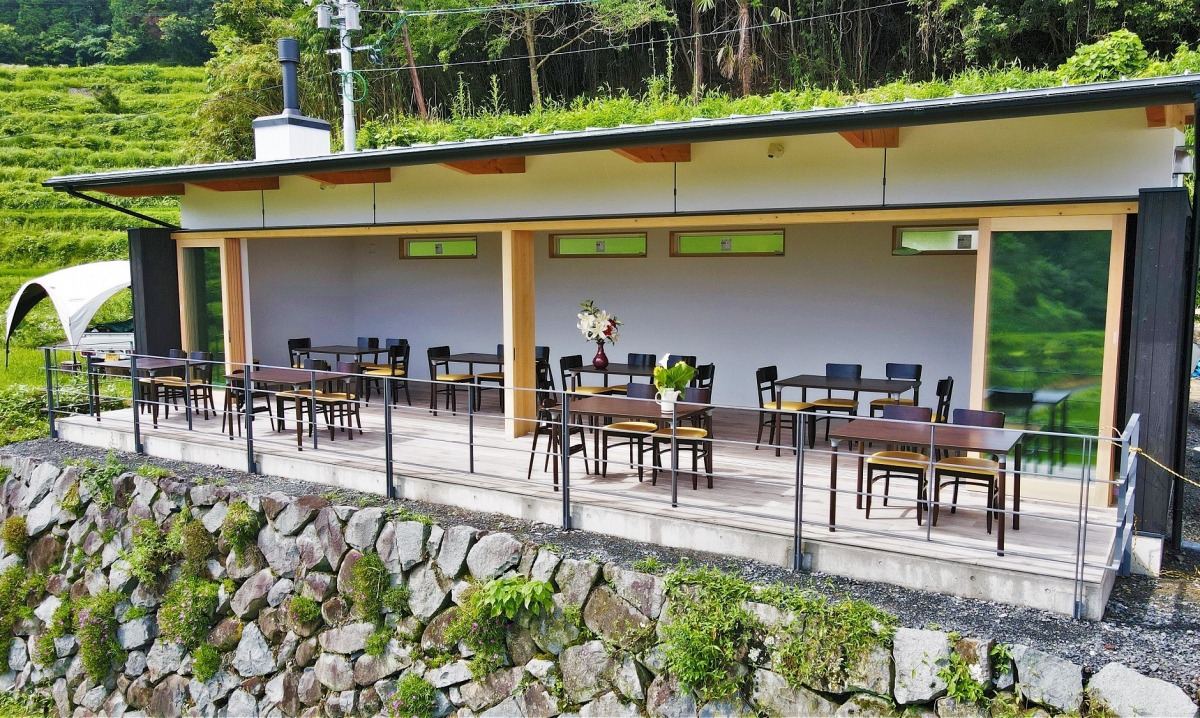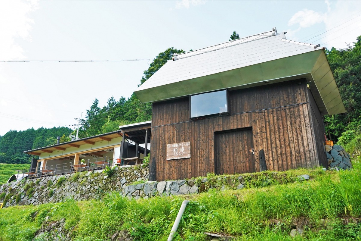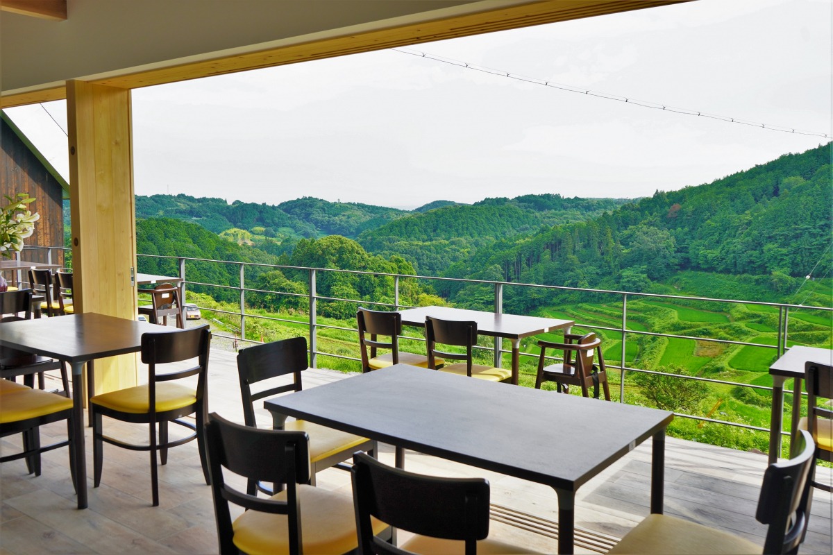 2017年に築70年の古民家を改装してオープンした「棚田テラス 籾庵」。2度の改築や増築を経て2021年8月、メニュー&空間ともに装いを新たにリニューアルオープンしました。窓がフルオープンになる新しいテラス席に座ると、眼下に広がるのは青々とした棚田。初秋と言えどもまだ日中は暑さを感じる9月の昼下がり、静けさの中に自然の音だけが聞こえ、涼しく心地良い風が吹き抜けます。