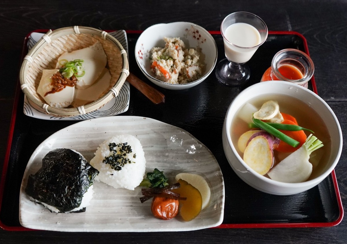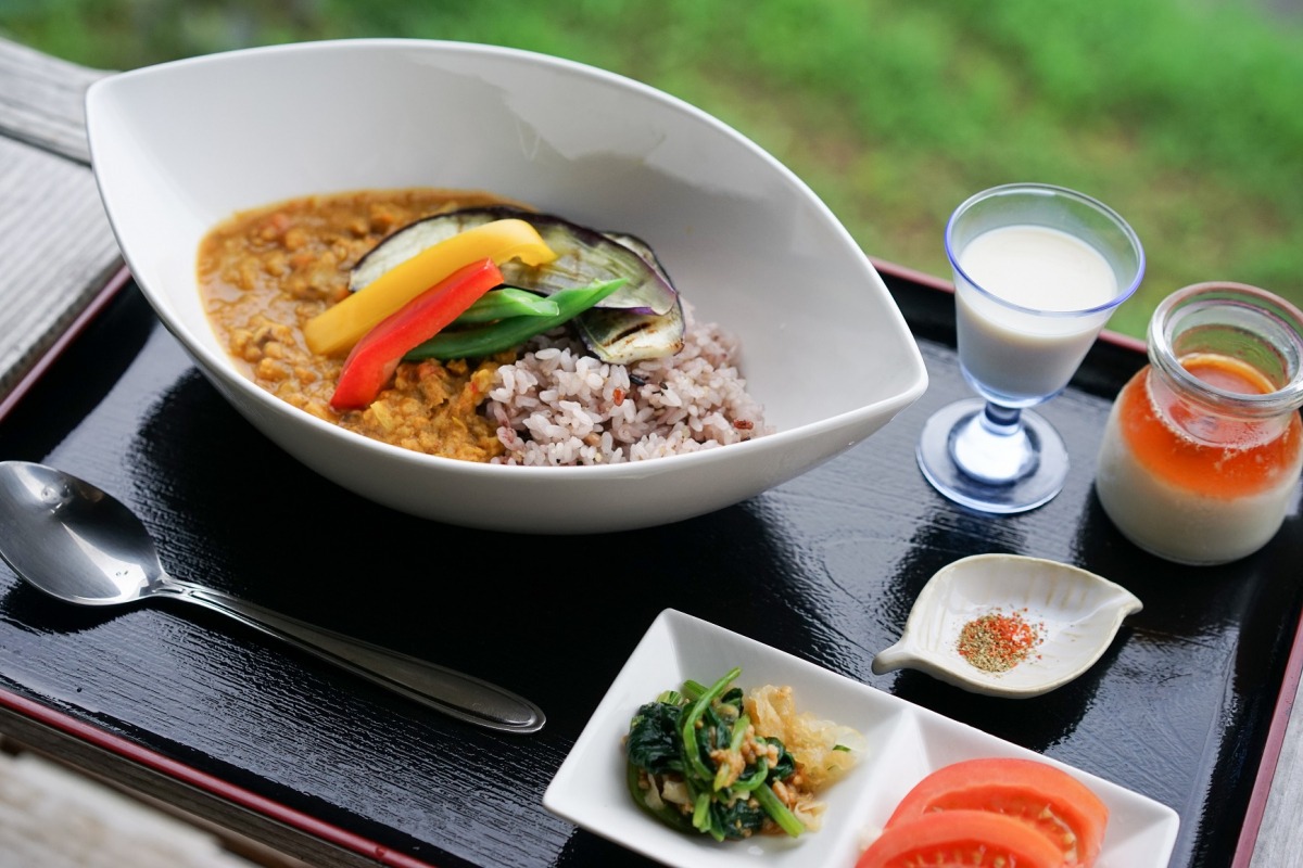 お店の料理のコンセプトは「体に優しく、免疫力を高める食事」。地元の野菜と発酵食、特産品の柚子や果物を使用した、こだわりのメニューが揃っています。一番人気は甘酒ドレッシングや自家製塩麴を使った「自然栽培のお野菜と発酵定食」(2,000円/要予約)。ほかにも、辛さを一味山椒で調整できる、スパイスの調合からこだわった「和風薬膳カレー」(1,500円)や、リニューアル前から人気の、自家農園で収穫した自然栽培の大豆を使った手作りの豆腐付きの「おにぎりセット」(1,500円/1日20食限定)もおすすめです。