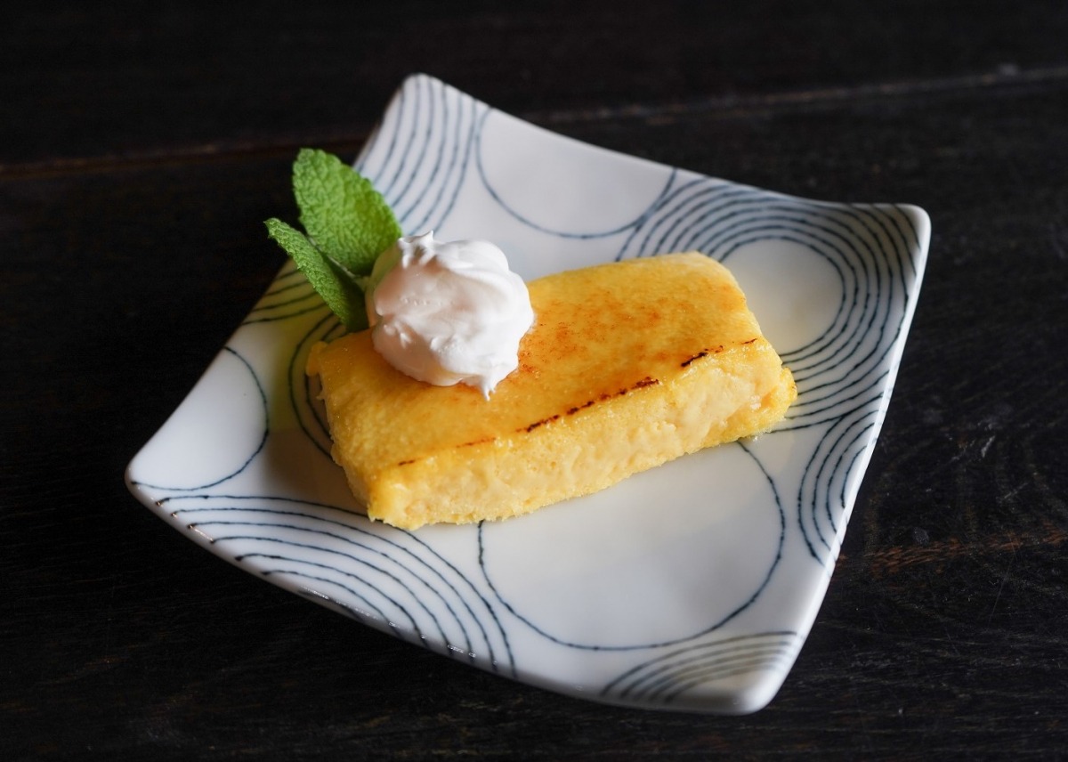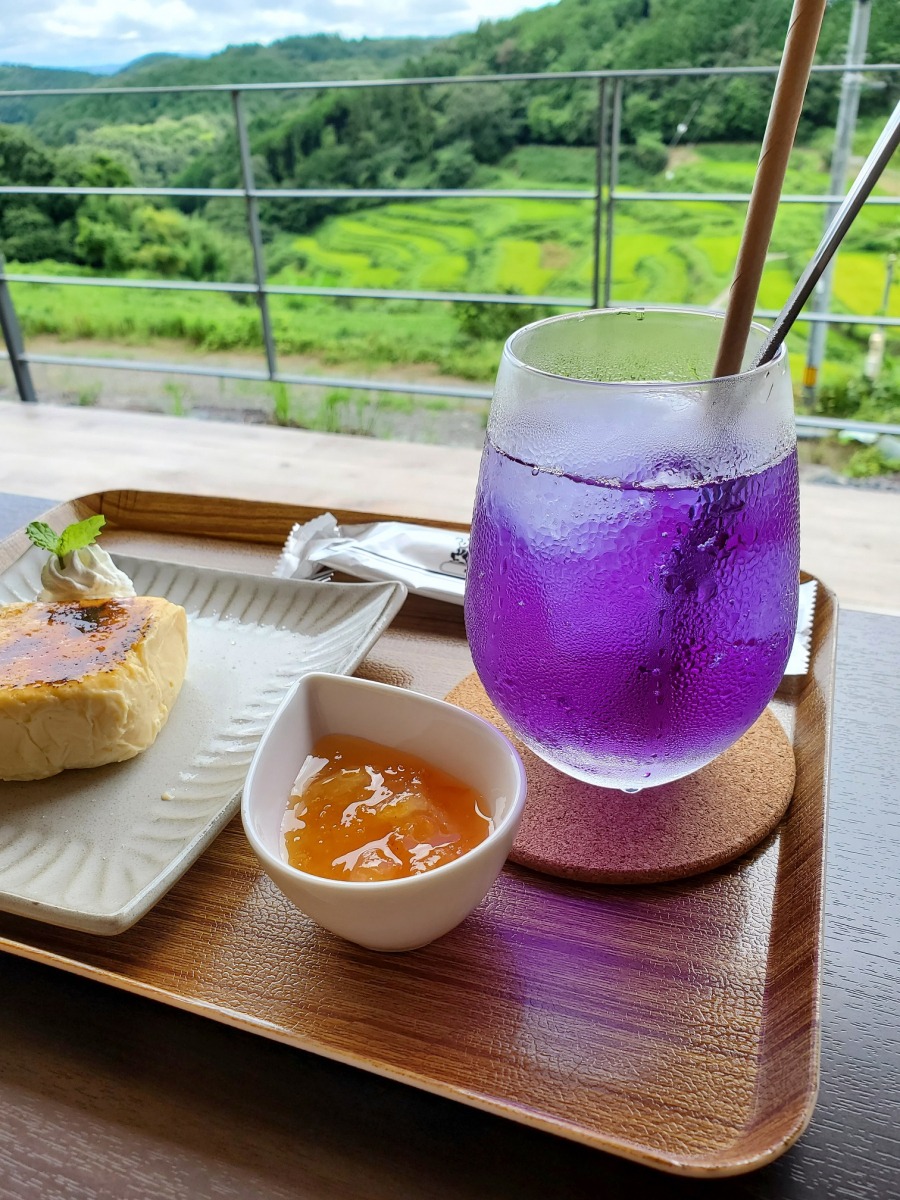 久米南町産の柚子ジャムを入れると綺麗なバイオレットに色が変わるソーダや、ゆず茶、自家製甘酒、豆乳のカタラーナなど、ドリンクやスイーツメニューもあるので気軽なカフェ利用もOK。また、土・日曜日限定のペット同伴で食事を楽しめる「上籾BBQプラン」(大人3,500円~)ではテント席を用意。多様な使い方ができるようになりました。