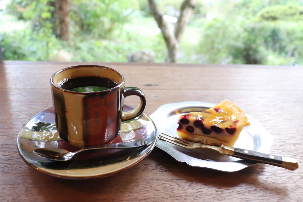 ケーキセットをお願いしましたが、ケーキは、吉備中央町で採れた無農薬のフルーツを使ったタルトケーキで、ブルーベリーのケーキを注文してみました。季節の食材を生かしたケーキがあるそうなので色々食べてみたくなりました。コーヒーは、鉄瓶で沸かして入れてくださるこだわりのコーヒーで、とても美味しいです。縁側の席で、お庭を眺めながらの癒しの時間を過ごせました。ランチもされているそうなので、また食べてみたいです。