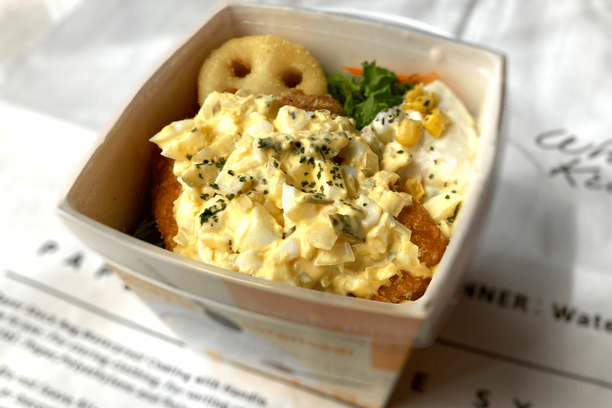 今回私は、サーモンフライをメインに岡山のご当地グルメ「えびめし」をチョイスしました。手作りのタルタルソースは具だくさんで、ふっくらとした身のサーモンフライと好相性。えびめしは、しっかしとした味付けに卵の風味もあって大人も子どもも大好きな味でした。我が家は息子(4歳)がえびめしを半分以上食べてましたね…。見た目以上にボリューム感あって、満足度の高い一品でした。