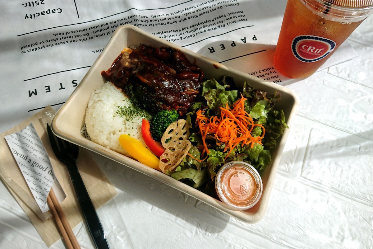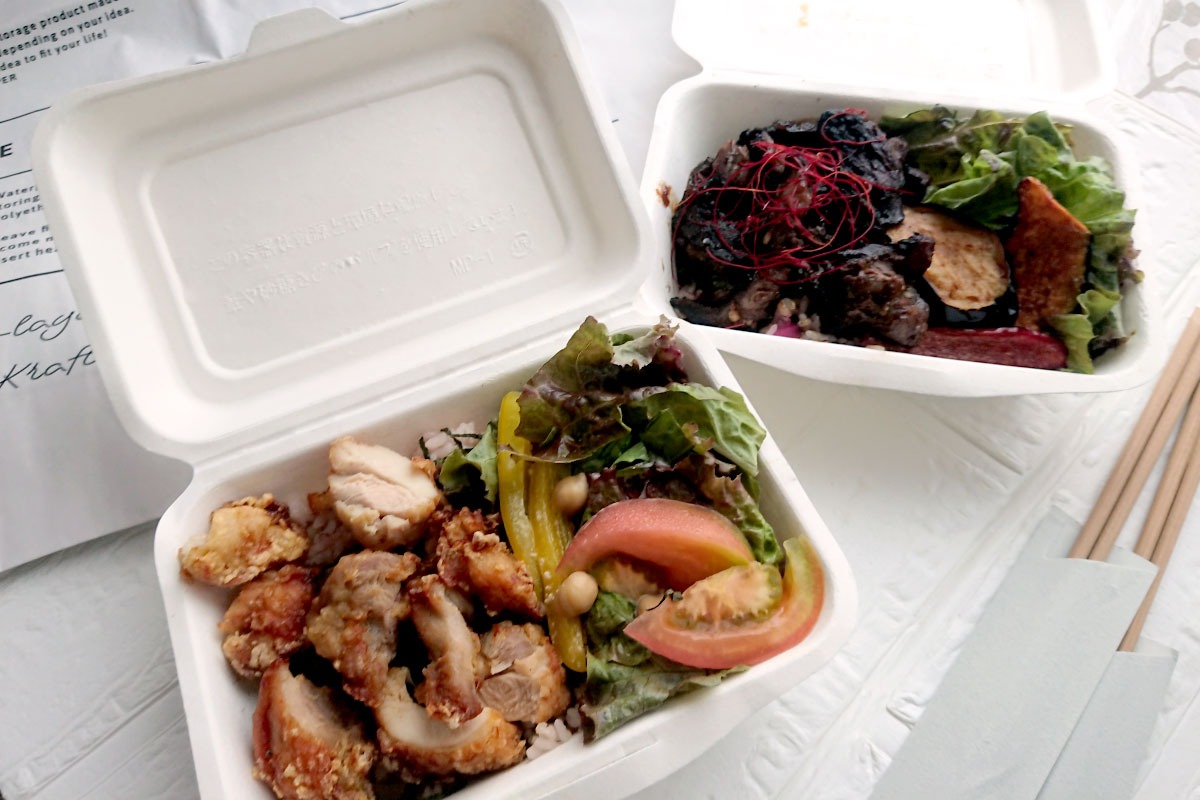 観光名所である倉敷美観地区内にあるオシャレなダイニングバー「cuore 倉敷」。岡山県内ではここでしか食べられない「手づかみシーフード」が有名な人気店です。日中はカフェとしてランチもやっており、今話題のヴィーガンランチが食べられます。今回私が注文したのは、cuore定番メニューの「牛はらみステーキ丼」とキングオブ岡山県のお弁当とも名高い「特製だれのとりめし」をテイクアウトしました。牛はらみステーキ丼のお肉は炭火で焼かれて香ばしい味わいで、しそと柴漬けが混ぜ込まれたご飯との相性が抜群。とりめしの方はcuoreの特製だれが鶏肉とごはんによく染みこんで箸が止まらない…!他にもヴィーガンカレーやファラフェルヴィーガン弁当などのヴィーガンランチもテイクアウトできますよ。