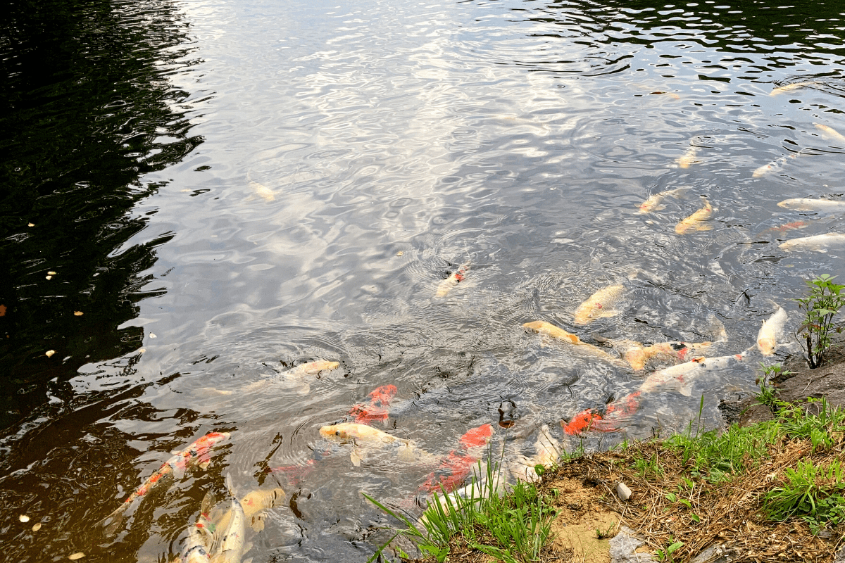 鯉が窪湿原の湖には、その名のごとく鯉がたくさん泳いでいます。湖のほとりに近づけば鯉が大集結してくれますよ。色鮮やかな鯉の模様が水中でゆらゆら揺れ、反射した水面と相まってなんとも幻想的。なにより、間近で見られる鯉は新鮮で、子どもも大喜びでした。