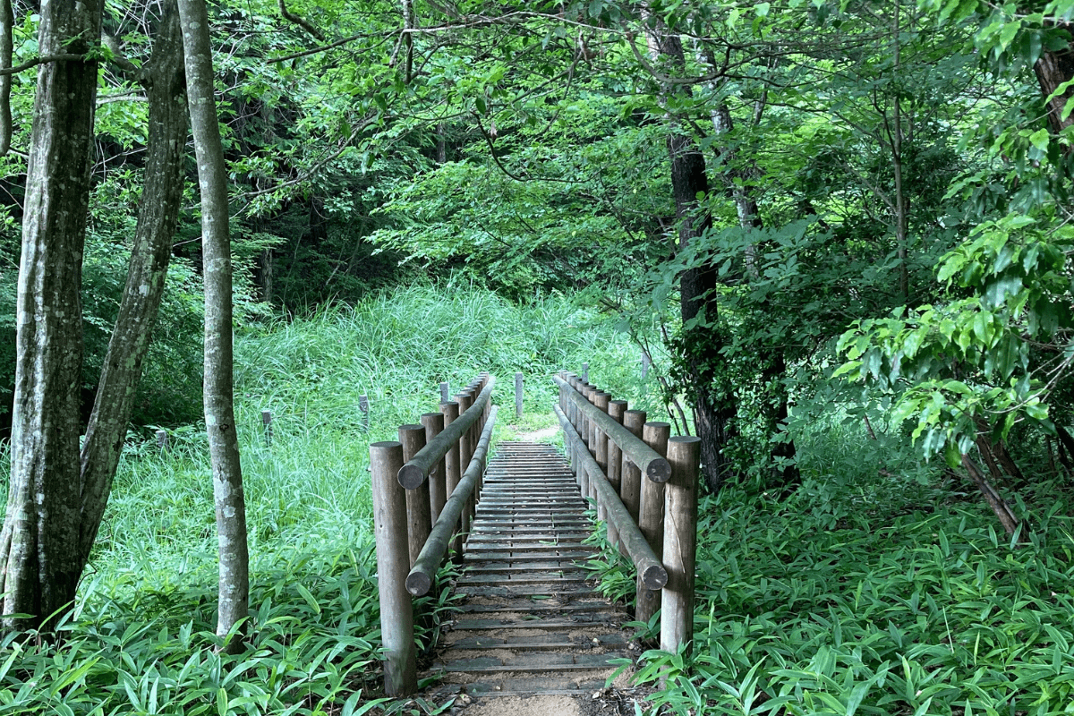 鯉が窪湿原のほとりにある遊歩道は、深い緑の中でしっかりと道筋を示してくれています。自然に馴染んだ木製の遊歩道は、どれも絵になりフォトジェニック。