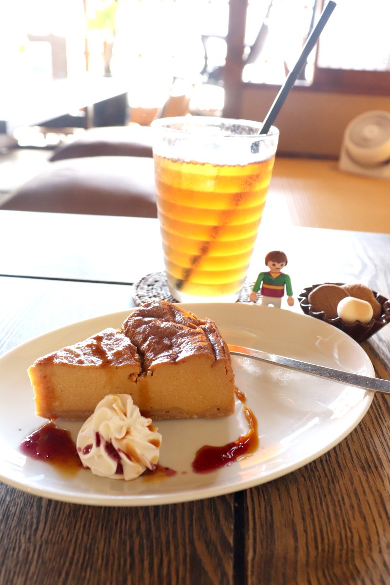 帰り道は、国道429号線沿の歩道を走って帰りました。サンロード吉備路のお隣、丘の上に建つ古民家カフェ、「珈琲と人」でひと休み。ケーキを頂くことにしました。カフェの名前の通り、こだわりのコーヒー豆で、ネルドリップのシングルビーン珈琲が人気のお店です。店内のオーナーさんおすすめの本を手に取って、コーヒーを飲みながらゆっくりと時間を過ごしたくなるような店内です。民宿をリノベーションしているので、天井の梁は見ごたえあり、店内は広々した中に昔懐かしいインテリアがところどころに置かれていて居心地満点です。
