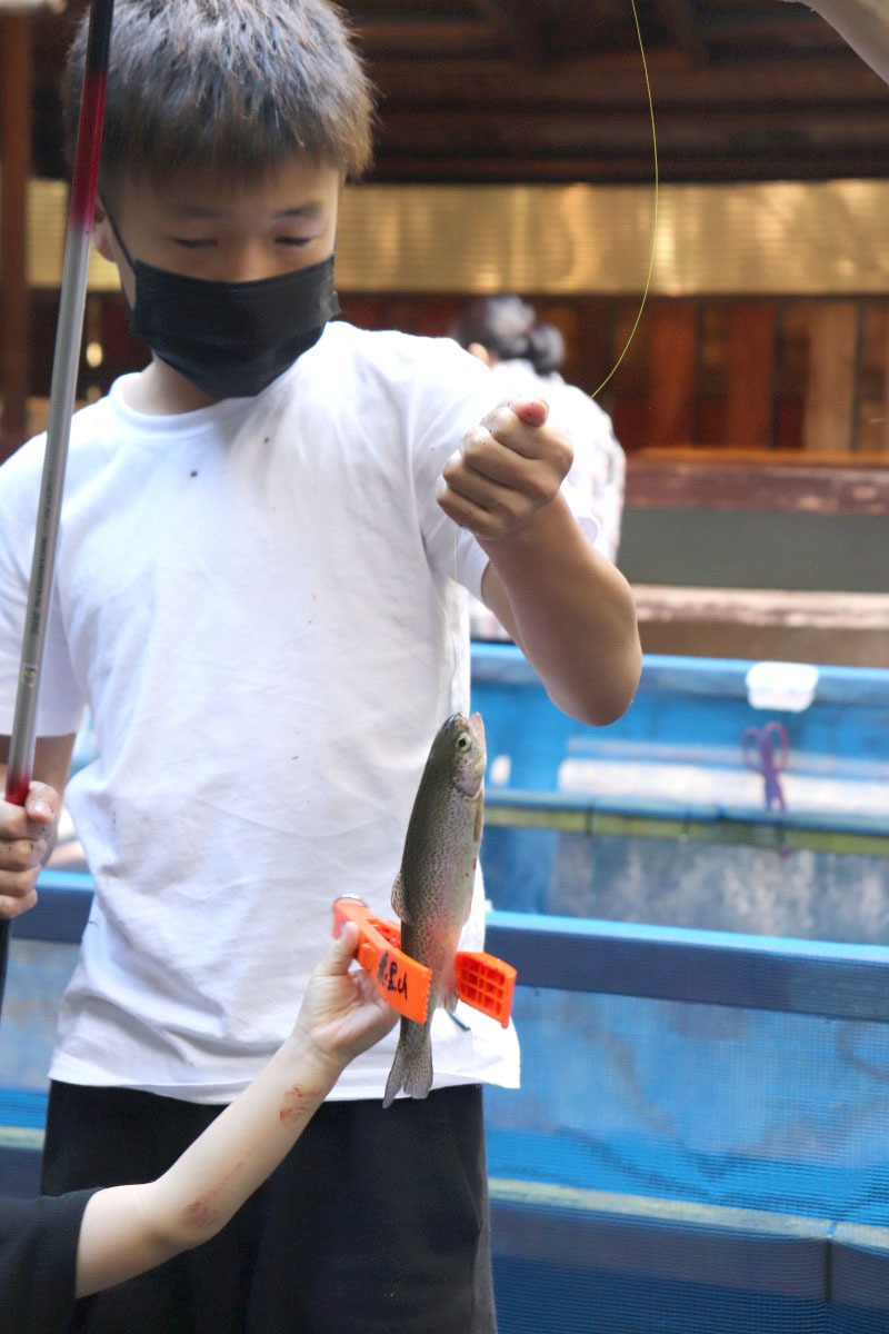 駐車場に着いた時から、「釣れた~!!」と声が聞こえていたご兄弟に許可を得て、取材に協力してもらいました。お兄ちゃんが餌をつけて釣り堀に垂らして間もなく、竿がぐいぐい引っ張られ、約20cmくらいのニジマスが引き上げられました!