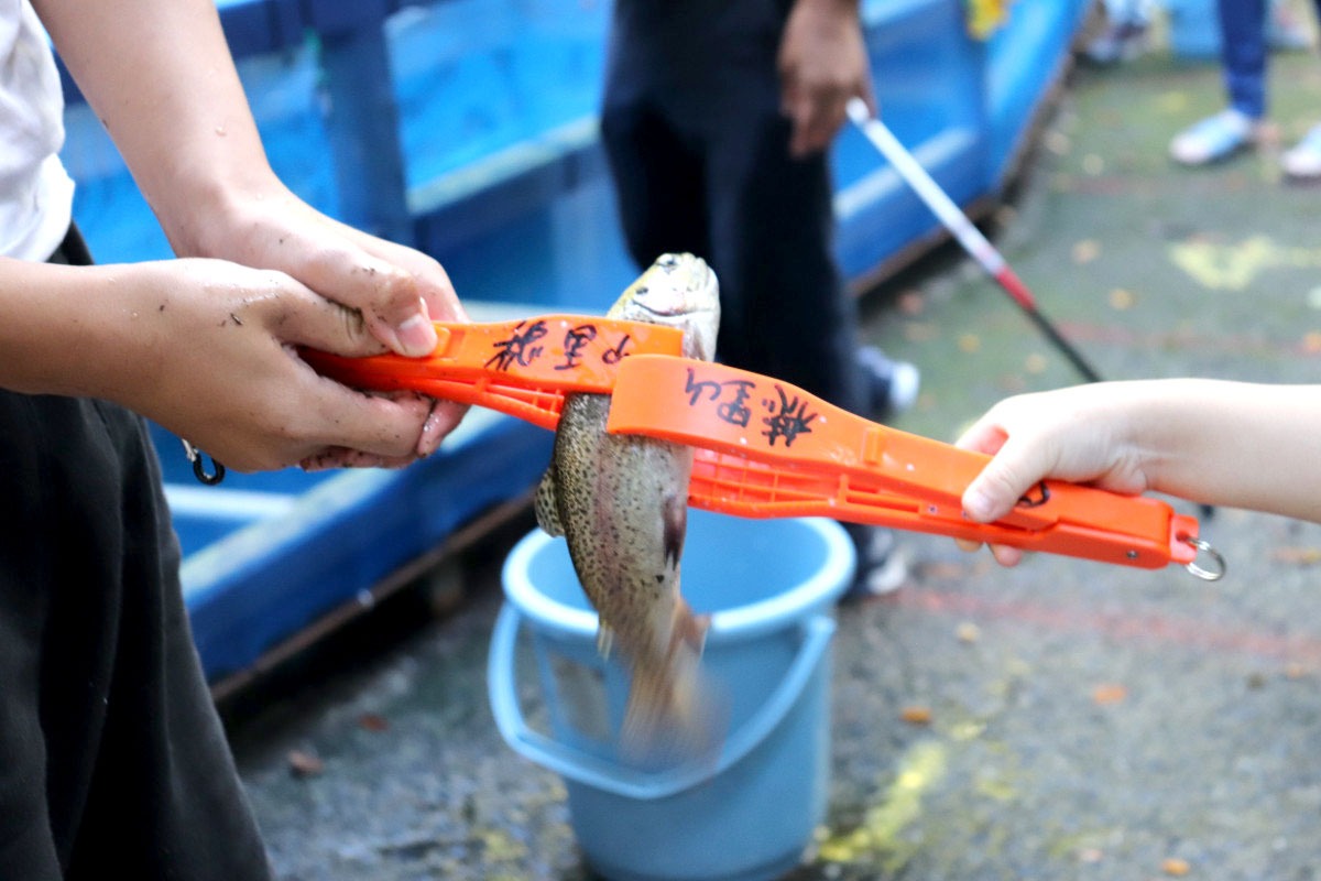 引き上げてうれしさいっぱいの私でしたが、魚の飲み込んだ針がはずせないので、堀さんにはずしてもらいました。そのとたん、魚は地面に跳ね上がり、挟む道具で捕まえ、やっとバケツに・・・。その後、面白いように釣れて、6匹釣りました。(釣った魚は釣り堀には戻せないのでご注意ください)
