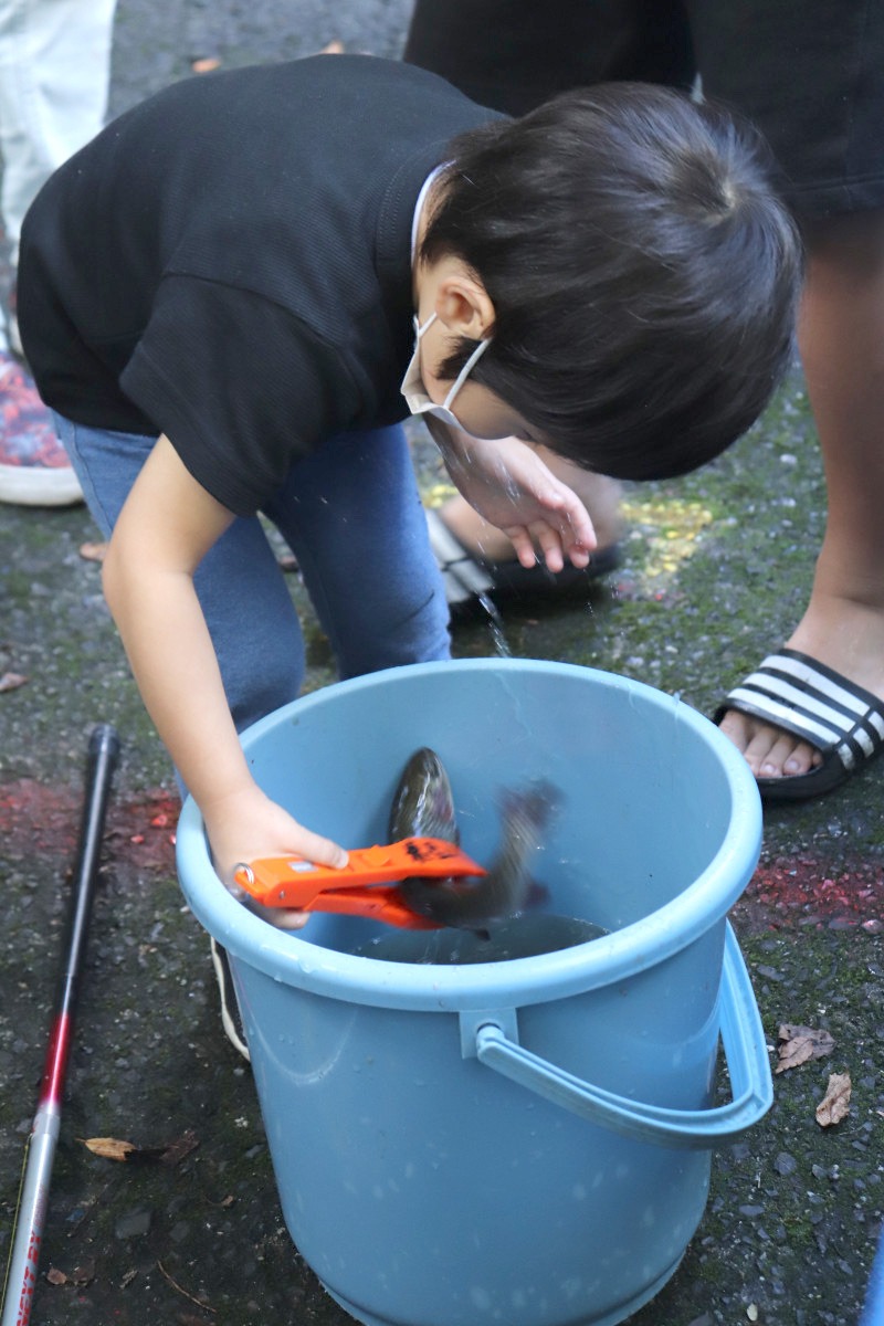 やっと捕まえた魚は、バケツに入れました。最初死んだふりをしていましたが、すぐにバケツの中を泳いでいました。「捕まえた!!」、さすが男の子、見ていて私も楽しい気持ちになりました 笑。