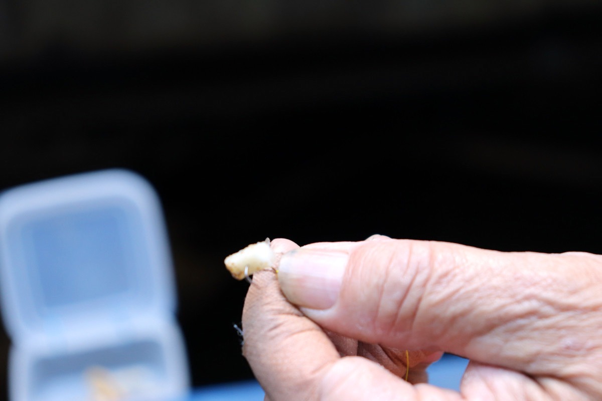 餌の付け方を見直し、釣り堀に垂らしてみました。「餌は水の深いところまで沈めた方がええ。魚が食いついてくるから。」との堀さんの言葉のとおりにすると、ぐいぐい竿が引っ張られ、釣れました!