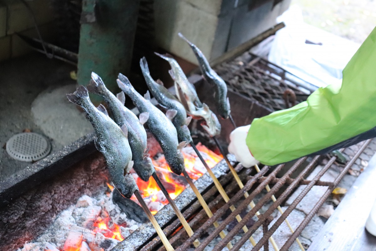 自然豊かな森の中にある「穂里山」では、水温が下がるのを待って、10月~6月くらいまで釣り堀をオープンされています。水温に応じて、10月は、ニジマス、その後、ヤマメ、イワナ、アマゴなど約800匹が釣り堀の中を泳いでいます。面白いくらい釣れて、そのまま串にさして炭火で焼いてくださり、焼き立て熱々を頂くことができ、美味しさ格別です!! 釣りが初めてでも、アウトドアが苦手でも、子供から大人まで楽しめます。