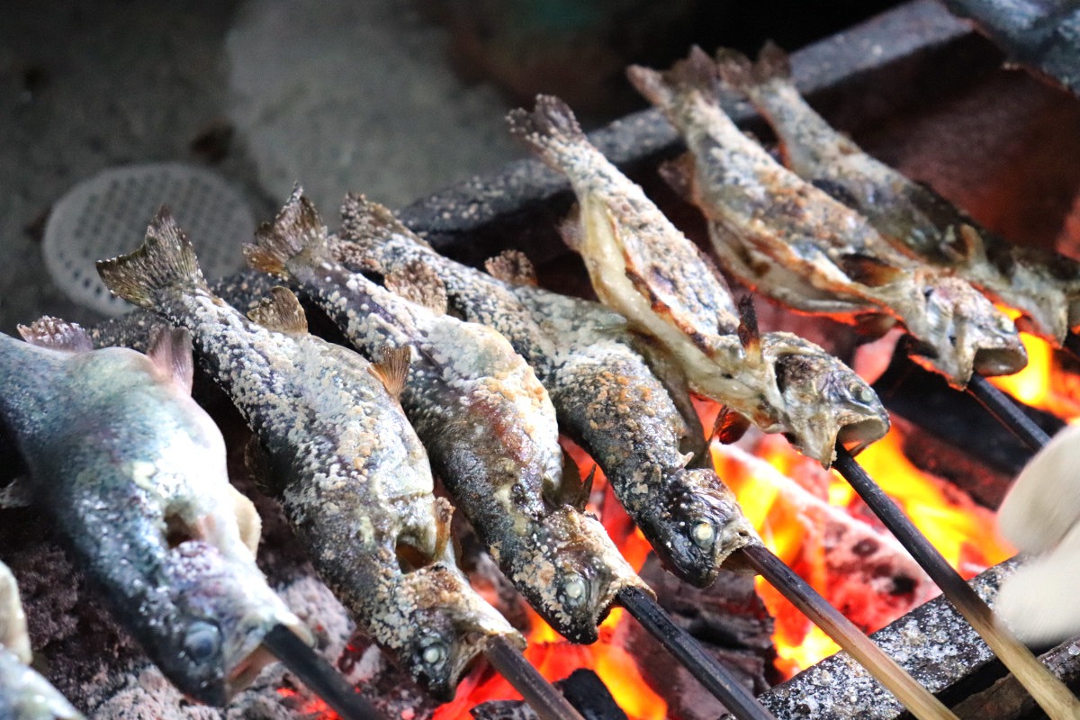 料金:竿は1本500円。ニジマス1匹400円、ヤマメ・アマゴ1匹500円、イワナ1匹600円(変動あり)。焼き代1匹100円。