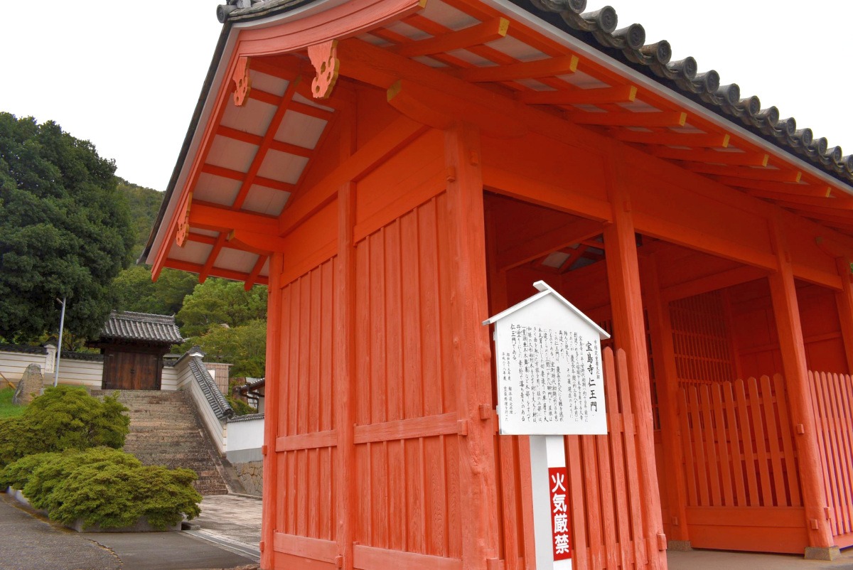 バス停から徒歩10分ほど。朱色の仁王門がとっても色鮮やかな宝島寺です!倉敷市重要文化財の仁王像や、六角の閻魔堂なども見応えありますよ。山裾には、宝島寺・慈眼院・真如院と、3つのお寺が集まっているので、年末やお正月などにゆっくり訪れてみるのもいいですね。