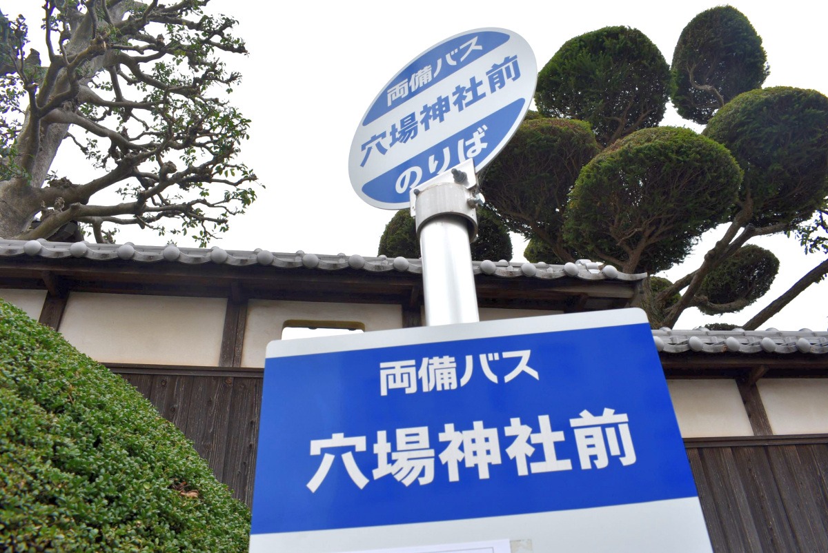 こちらもまた、ナゾめいた名前のバス停です!境内にある看板には「愛媛県・大山祇神社より分霊」との一文が。大山祇神社の境外には、阿奈波(あなば)という名の摂社もあるようなので、何かつながりがあるのかも?しれません。長命富貴や子宝祈願。さらには、高梁川周辺の疫病を収めたとして、疫病退散にもご利益があるんですって。