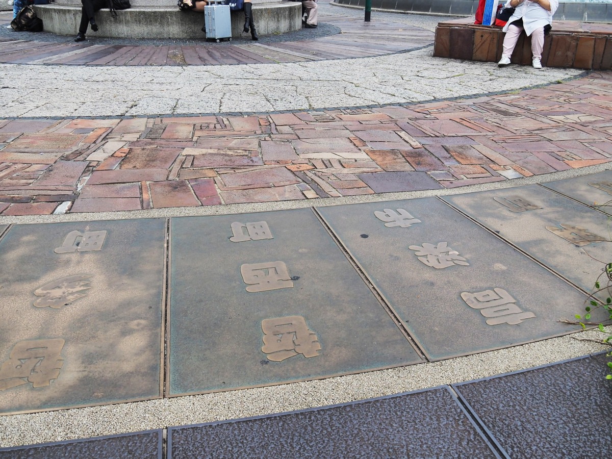 この台座は岡山の歴史と文化を象徴するパブリックアート「吉備沃野(きびよくや)」。備前焼、鉄、岡山県特産の万成石(まんなりいし)、岡山県の木・アカマツなどが使われています。