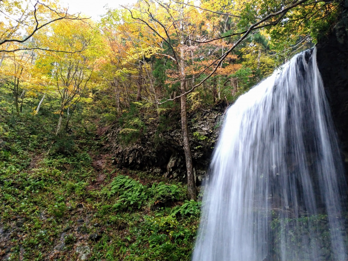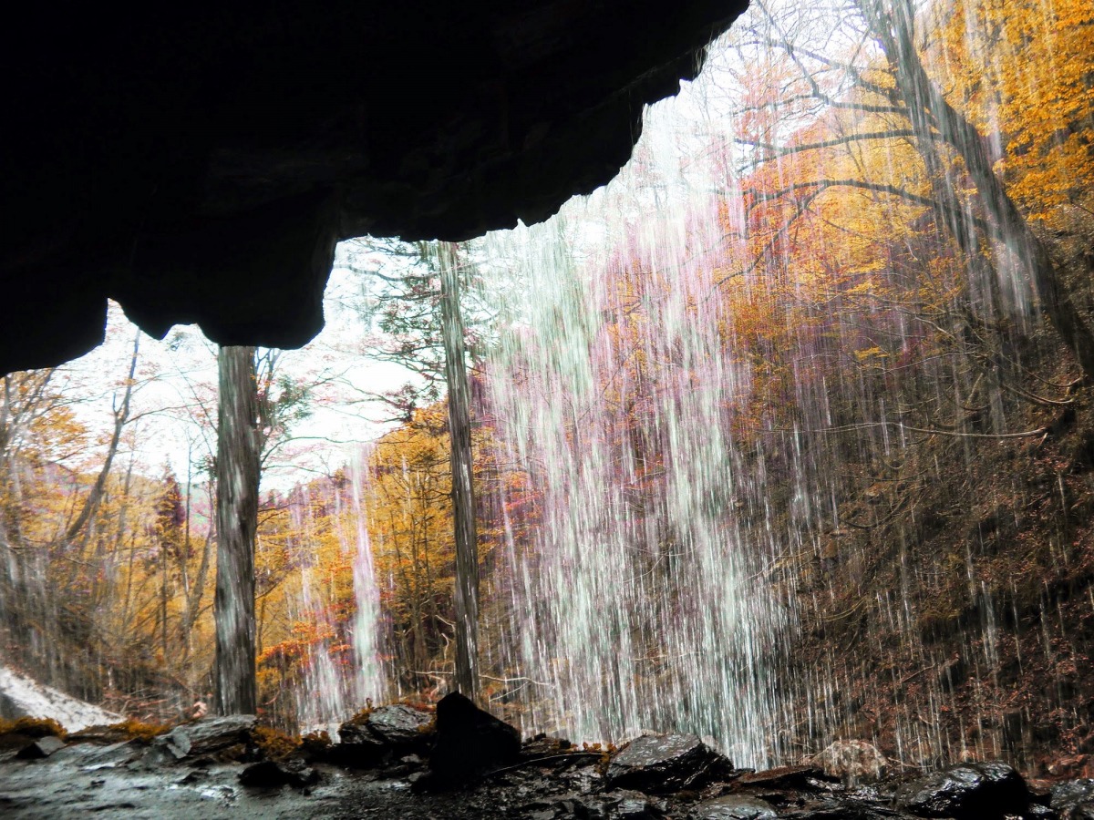 高さ約10m、幅6mの岩井滝は、滝の裏側へまわり込める“裏見の滝”。滝の上部に大きな岩盤が突き出し、滝の裏側から流れ落ちる清水を見ることができます。駐車場から滝までは約400mの遊歩道が整備され、散策しながら周辺の紅葉が楽しめます。