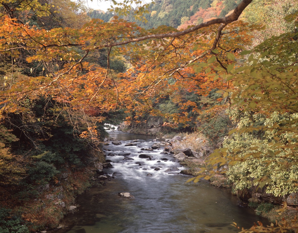 奥津温泉の下流3kmに渡り流れる吉井川沿いの渓谷で、国の名勝に指定されています。毎年10月下旬から11月中旬にかけて渓流沿いの木々が赤や黄色に染まり、風情に富んだ渓谷美とともに息をのむような秋の絶景を楽しむことができます。