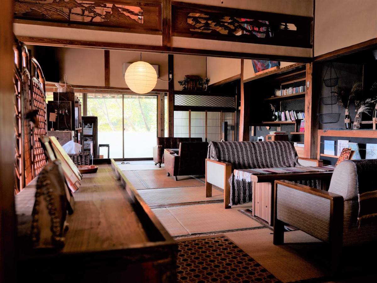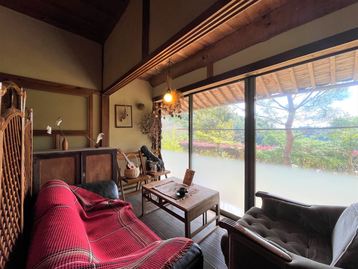 二間続きの座敷やL字の縁側に置かれたテーブルやソファーは全部ばらばらで、元々この家にあったものも使われているそう。座る席によって見える景色が異なるので、その日の気分で“居場所”を選ぶのも楽しそうです。