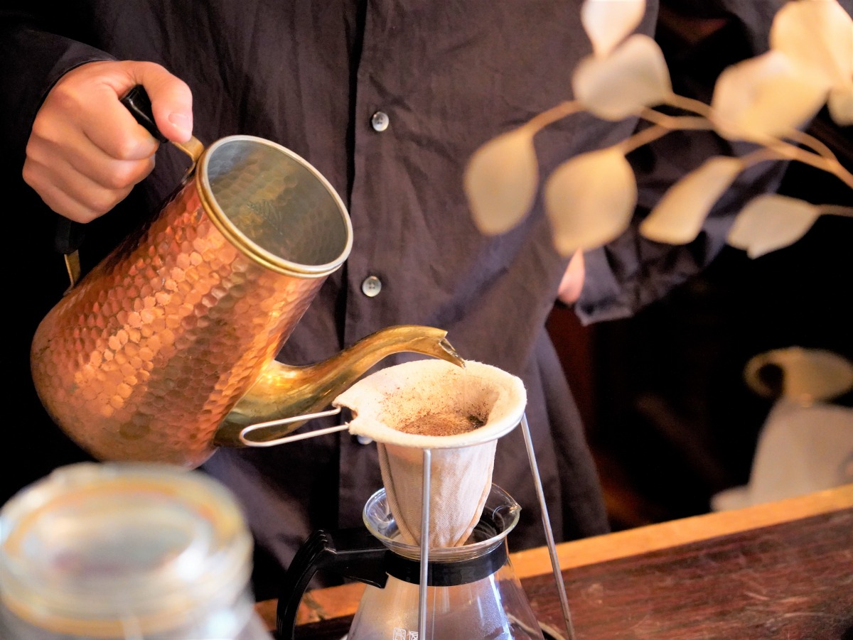 ネルドリップで淹れられる自家焙煎のコーヒーは、深みとまろやかさを感じる味わい。お湯が注がれると辺りにふわりと芳醇な香りが広がります。