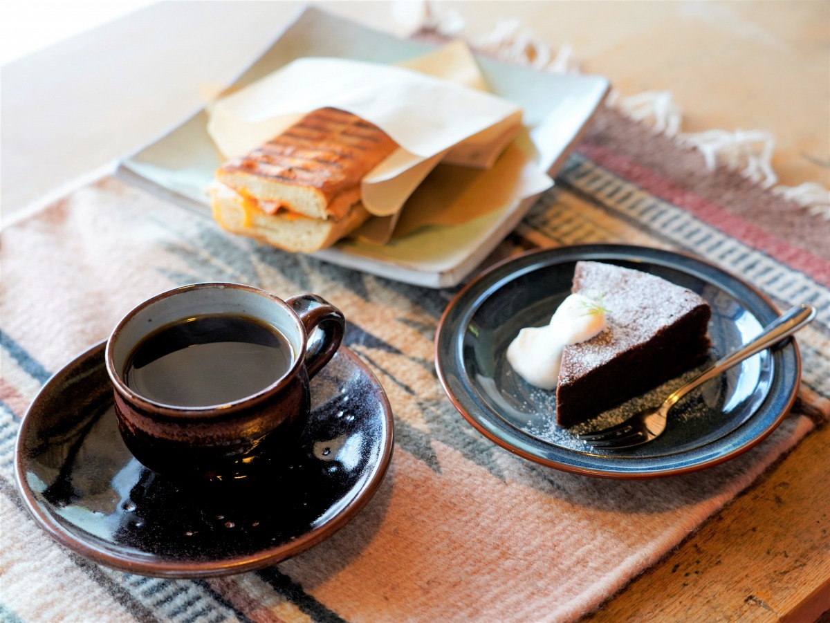 珈琲と一緒にオーダーしたいスイーツや軽食メニューも。手づくりのガトーショコラはしっとりとした食感で食べ応え十分。自家製のローストポークを使って作るキューバサンドは映画から着想を得て生まれたメニューだそうで、スパイスと酸味が効いたクセになる味です。今秋からは地元の食材を使ったオープンサンドとスープのセットなど、新メニューも登場しました。