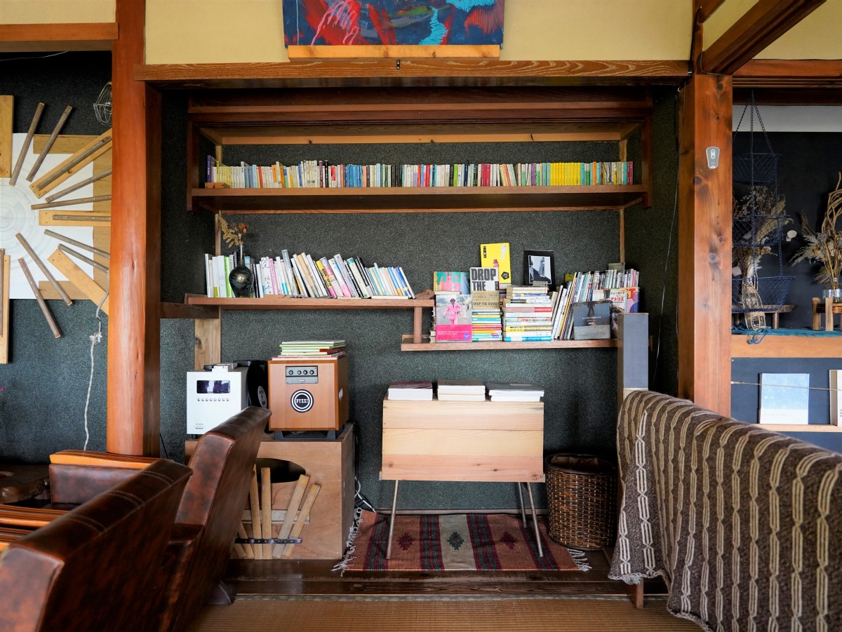 店内のいたるところに小説や絵本、漫画、雑誌、楽器やアート作品などが置かれ、その雑多感がかえって心地よい空間になっています。肩ひじ張らない雰囲気の中で、気になる本を読みながら過ごすのもおすすめです。