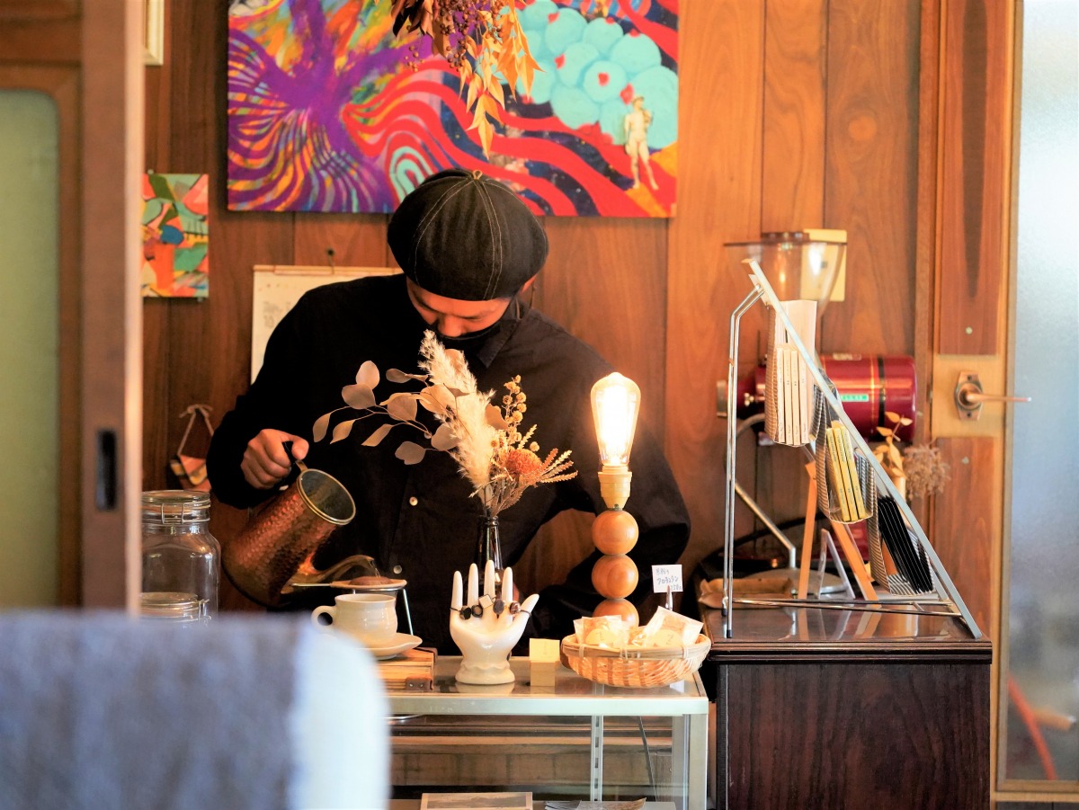 店主がコーヒーを淹れるカウンターの後ろにもアート。ビビットな色づかいの作品も不思議と馴染むのは、古民家の持つ懐深さゆえかもしれません。ほかにも雑貨やアクセサリーなど、ハンドメイドの品が並びます。この場所は、表現する側とそれを受け取る側の"媒介”となっているようです。