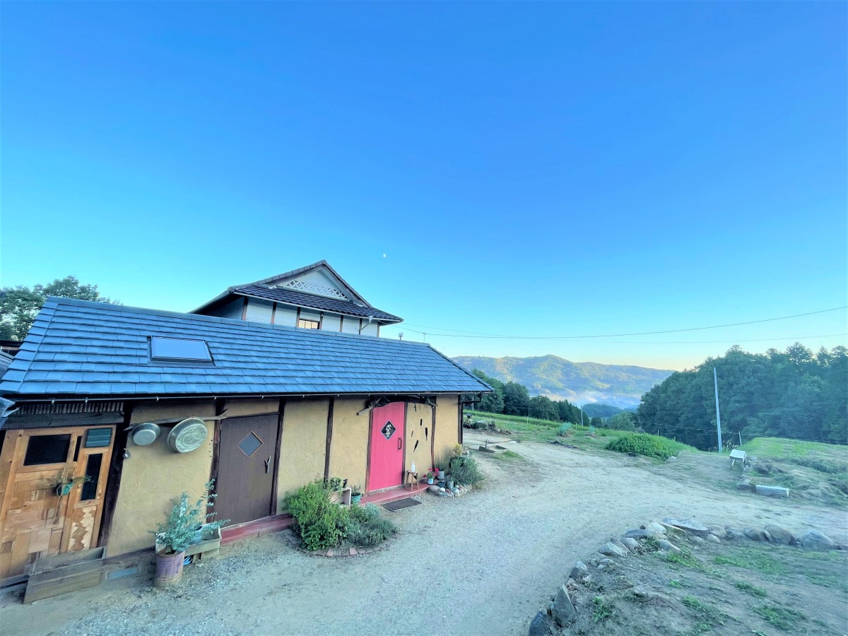 母屋の隣に建つ納屋を改装した店舗は、木の梁や土壁など自然素材に囲まれた空間になっています。頭上に架かるコットンの布やドライフラワー、リースもナチュラルな雰囲気にぴったりです。ランダムに配置された窓は周囲の森や空を映し、まるで絶景を切り取る額縁のよう。