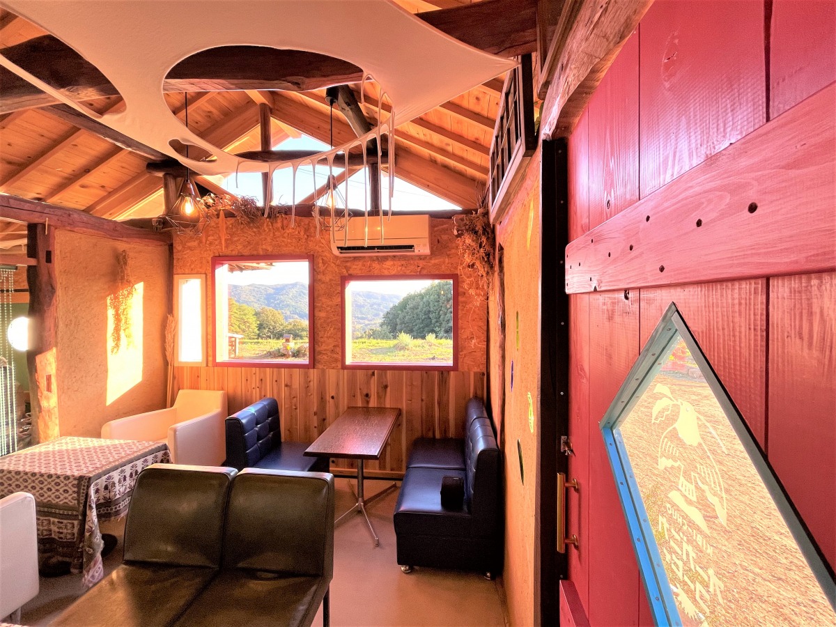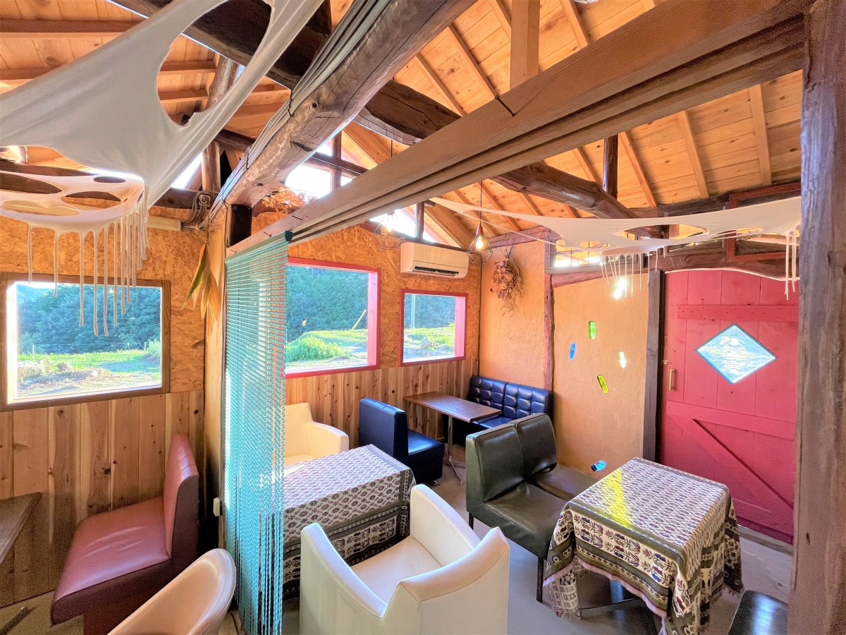 店主自らリノベーションした店は、梁のカーブに合わせてあえて歪な形にカットされた扉や土壁に埋め込まれたカラフルな瓶など、遊び心が随所に伺えます。陽が入る時間や角度によってさまざまな光が店内を彩ります。