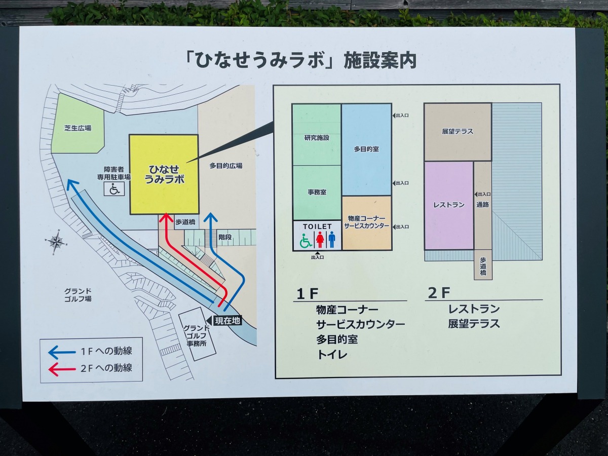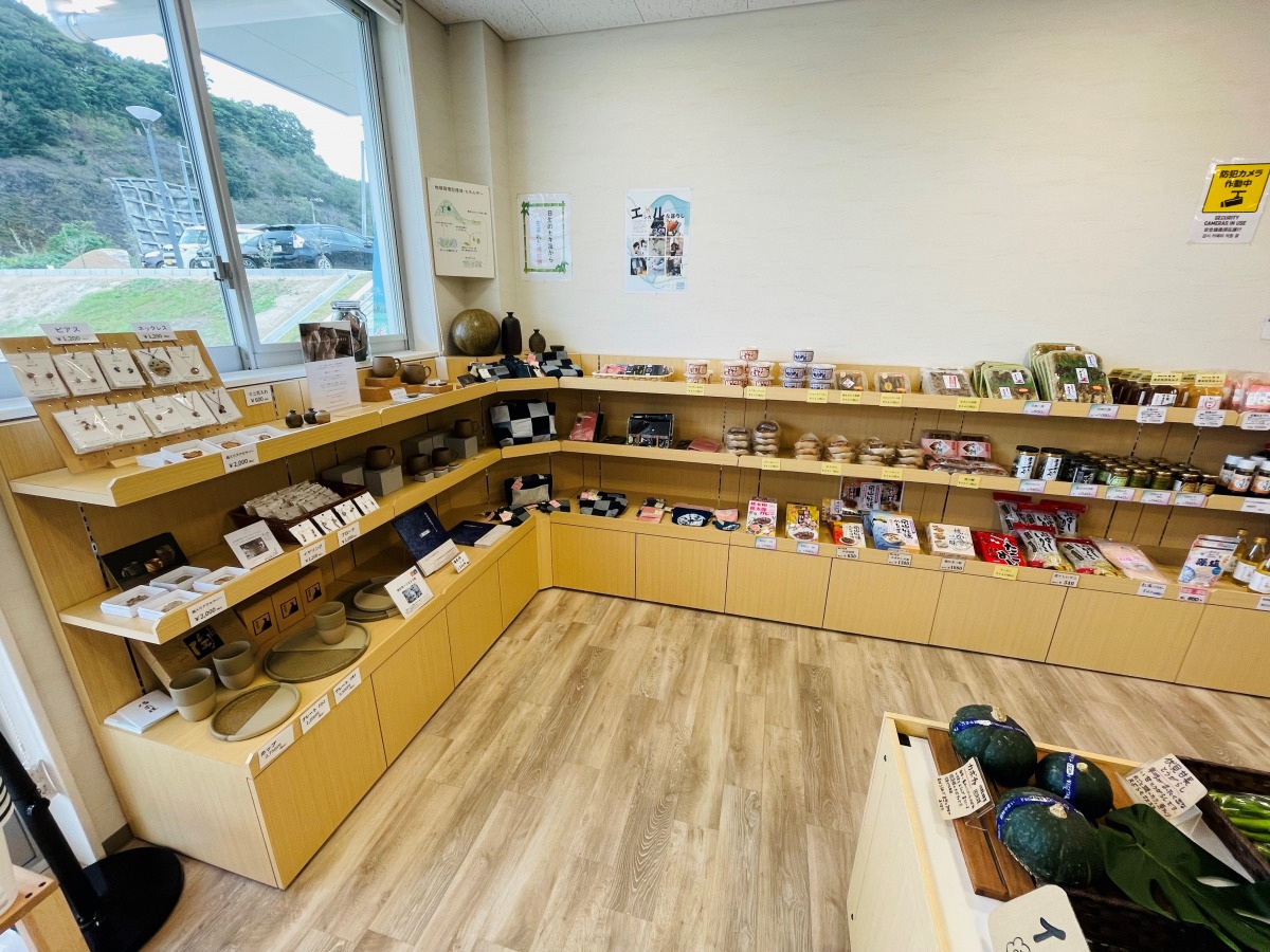 2階建ての建物で、1階には物産コーナー、サービスカウンター、多目的室、トイレなどがあり、2階には展望テラスがあります。