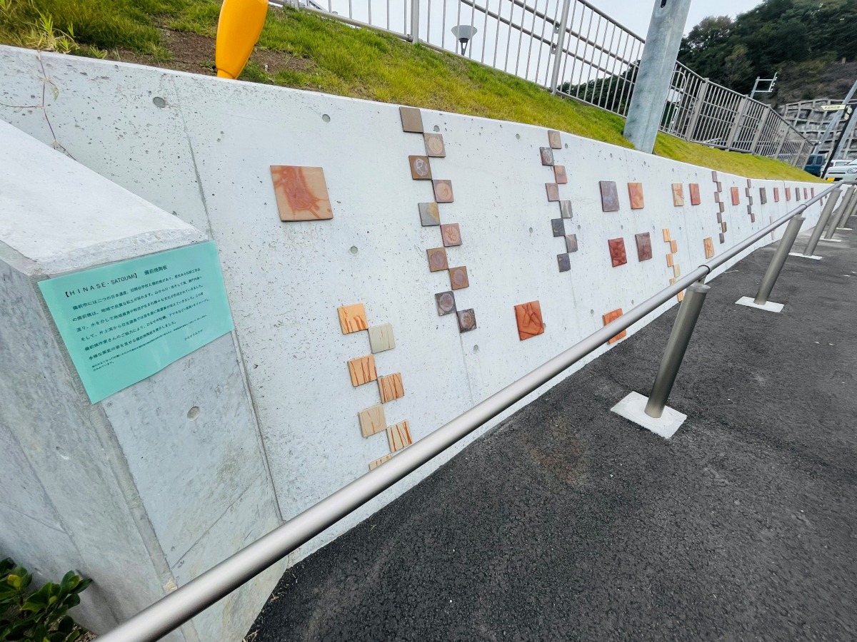 芝生広場から駐車場の方に歩いていると左側に現れる備前焼陶板。