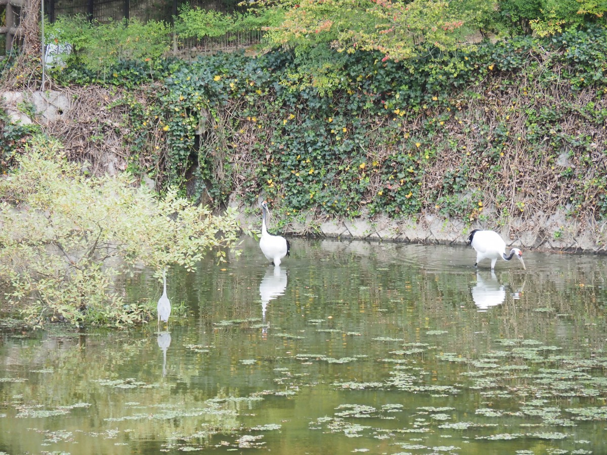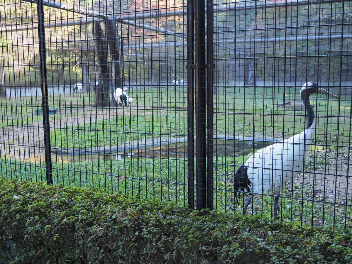タンチョウは岡山後楽園の北側にある鶴舎で見ることができます。8羽が飼育されており、そのうちの1羽はあまり人を怖がらず、かなり近くまで来てくれました。