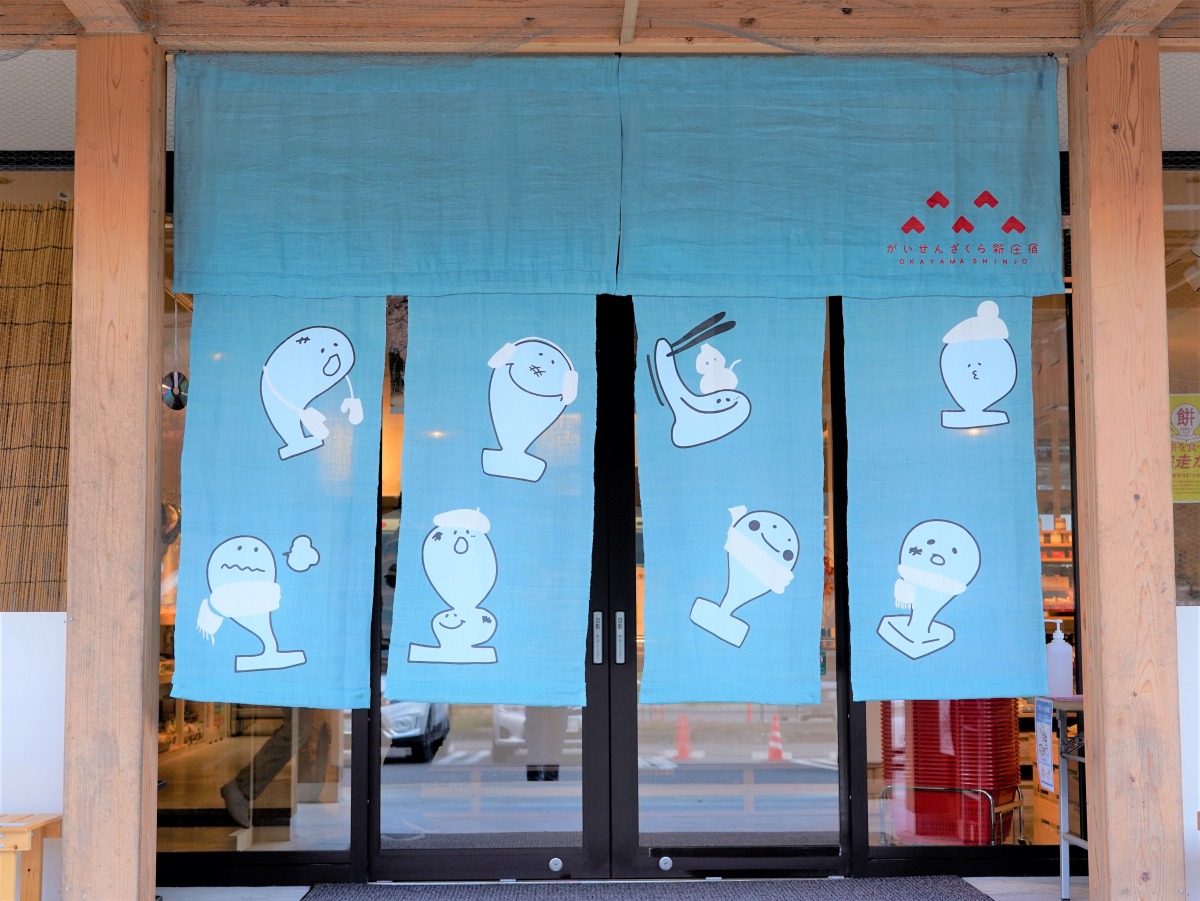 MOCHI-HACHIは“ひめのもち”のキャラクター。新庄生まれ新庄育ちのおもちの8人兄弟です。なぜ8人かというと、漢数字の八は末広がり、数字の8は横にすれば∞で縁起がいいから! 様々なグッズがあるので、身に付けたり身近に置いておけばラッキーなことがあるかもしれません。ちなみに道の駅の玄関にかかる暖簾は季節ごとに色もデザインも変わります。写真は冬仕様。