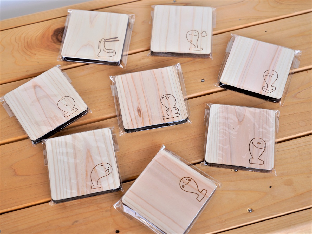山に囲まれた新庄村は林業の村でもあります。MOCHI-HACHIグッズの新商品のコースターは地元産の桧を使用。可愛いMOCHI-HACHI兄弟が刻印されたコースターをデスクに置いておけば、ティータイムや仕事の途中に彼らと目が合ってほっこり。