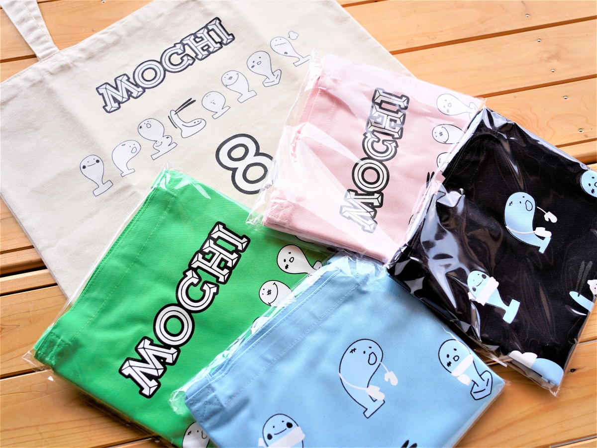 使い勝手のいいトートバッグはカラーもいろいろ。MOCHI-HACHI兄弟が一列に並んだデザインに加え、手袋やマフラー、毛糸の帽子、耳あてなど、冬の装いバージョンもあります。季節ごとのデザインが登場するのが面白い!