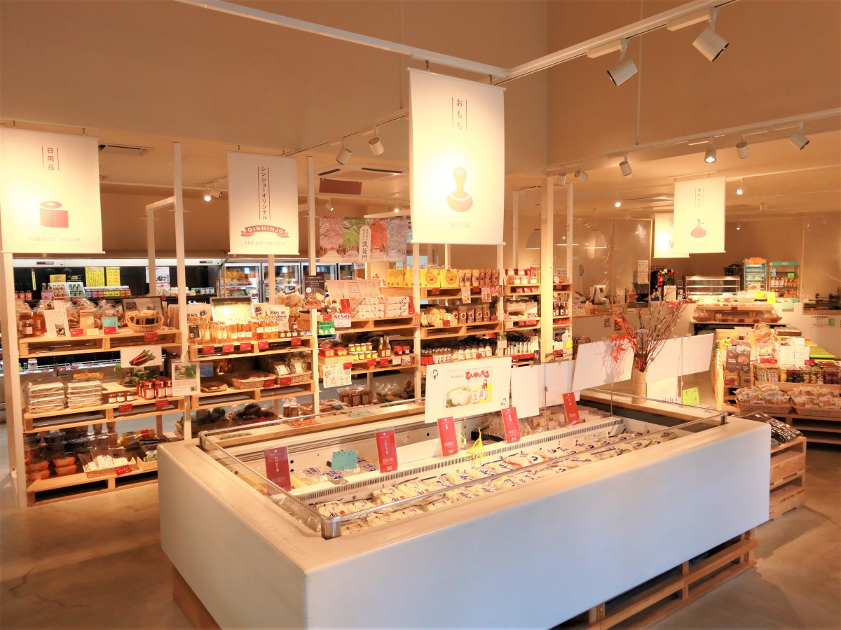 「道の駅がいせん桜新庄宿」には、MOCHI-HACHIグッズのほかにもチェックすべき“もち”要素がいっぱい。村のマーケットでは多彩な「ひめのもち」商品を取り扱っています。豚まんやおにぎりといったテイクアウトメニューもあり。また、併設のレストラン・村の食堂のオリジナル“もちグルメ”も必食です。