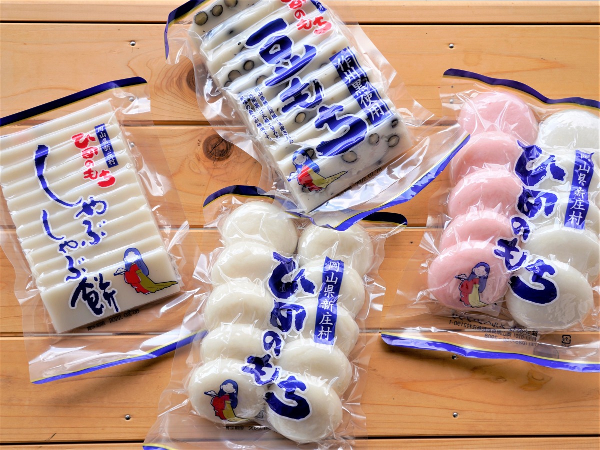 夏の昼と夜の温度差が激しく、餅米の生産に最も適した気候条件の新庄村。村全域で生産されているもち米の最高品種「ひめのもち」のお餅は、杵つきの丸餅や作州黒が入った風味豊かな豆餅、しゃぶしゃぶ餅、紅白餅などが並びます。まずはこちらを購入!