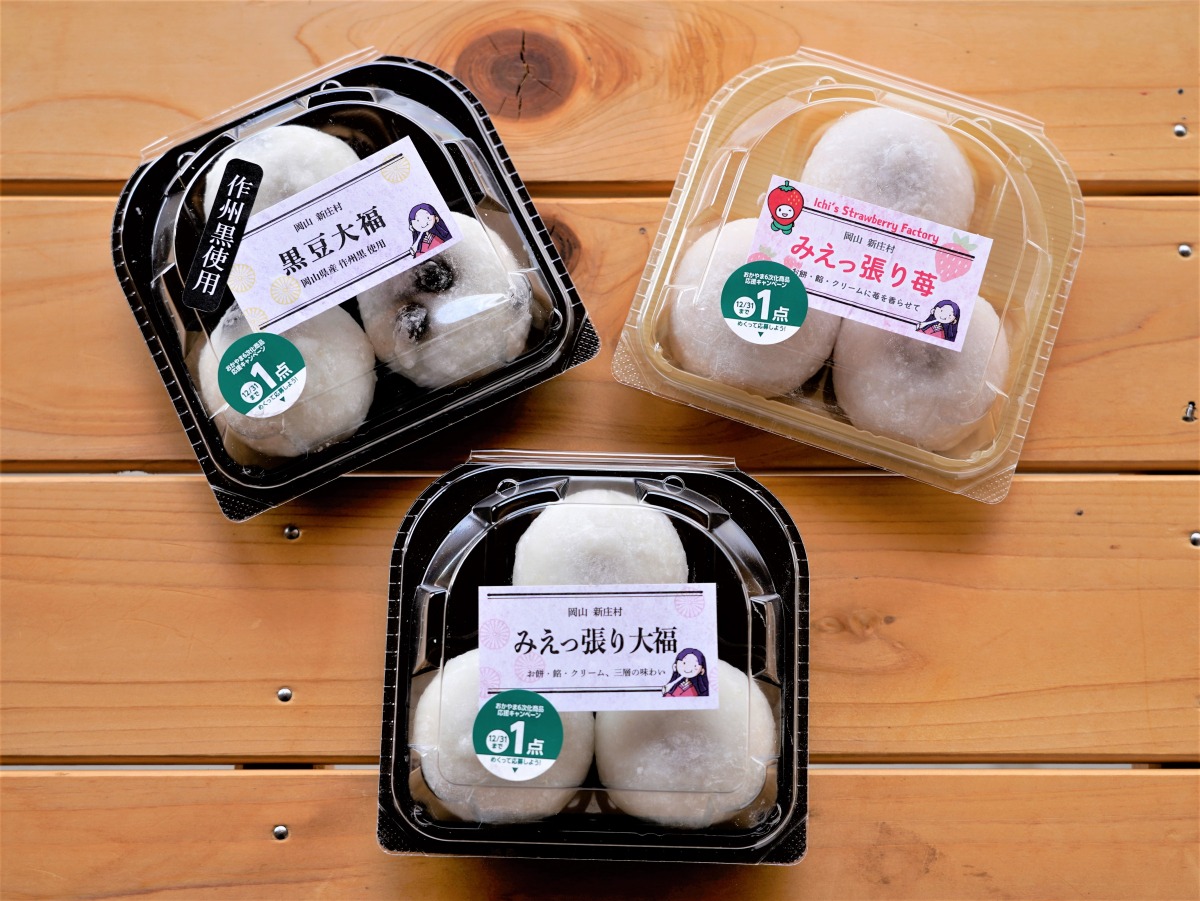 「ひめのもち」で作る大福は定番人気商品。こしあんと生クリーム入りのみえっ張り大福や、餅・こしあん・クリームにいちごが香るみえっ張り苺大福、岡山県産作州黒入りの黒豆大福のほか、季節限定でよもぎ大福やブルーベリー大福なども登場します。