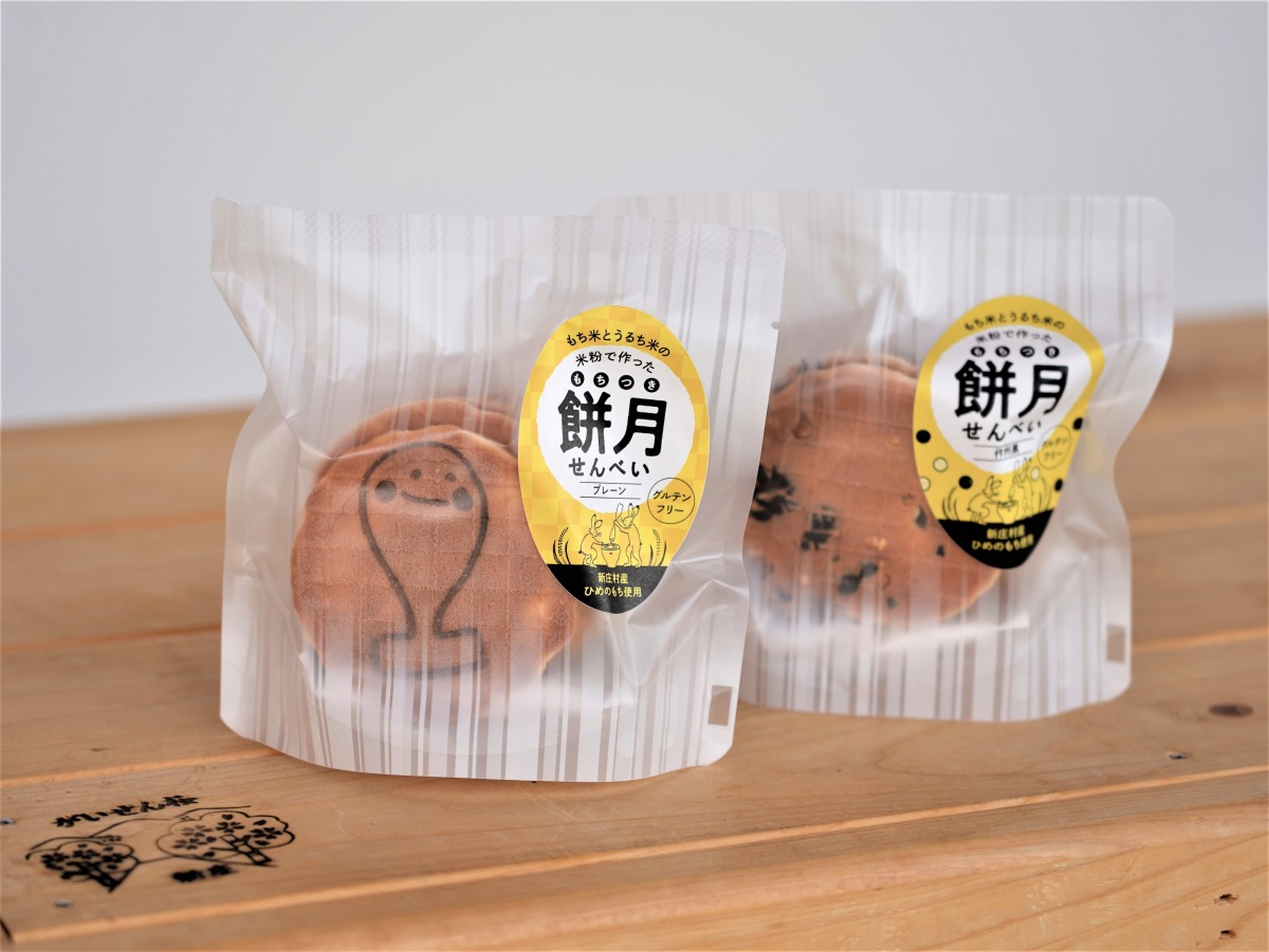 シンプルゆえに「ひめのもち」本来の甘さをダイレクトに感じる米粉の煎餅。プレーンと岡山県産の黒豆・作州黒入りの2種類あり、プレーンにはMOCHI-HACHIの焼き印が捺されています。