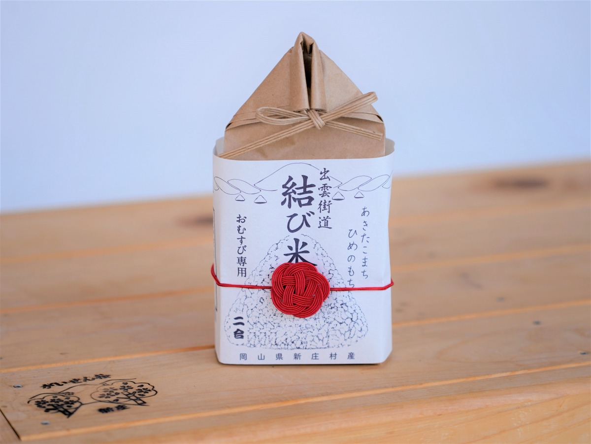 新庄村産のもち米「ひめのもち」とうるち米の「あきたこまち」をブレンドしたおむすび専用の「結び米」。もちもちふわふわの香りのいいおむすびが出来上がります。良縁に恵まれるようにと縁結び神社として有名な出雲大社で祈祷されたお米です。