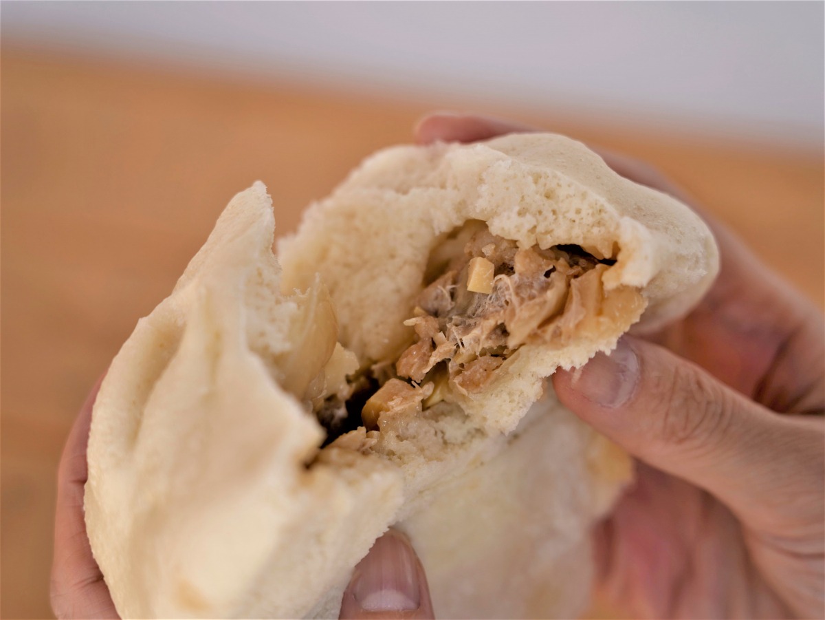 「ひめのもち」の米粉を使用した生地はふっくらもちもち、ほんのりした甘さがあっておいしい! 包まれた味付け餡は真備町産のタケノコのシャキシャキ食感と溢れる肉汁がたまりません。大きいので1個で大満足です。
