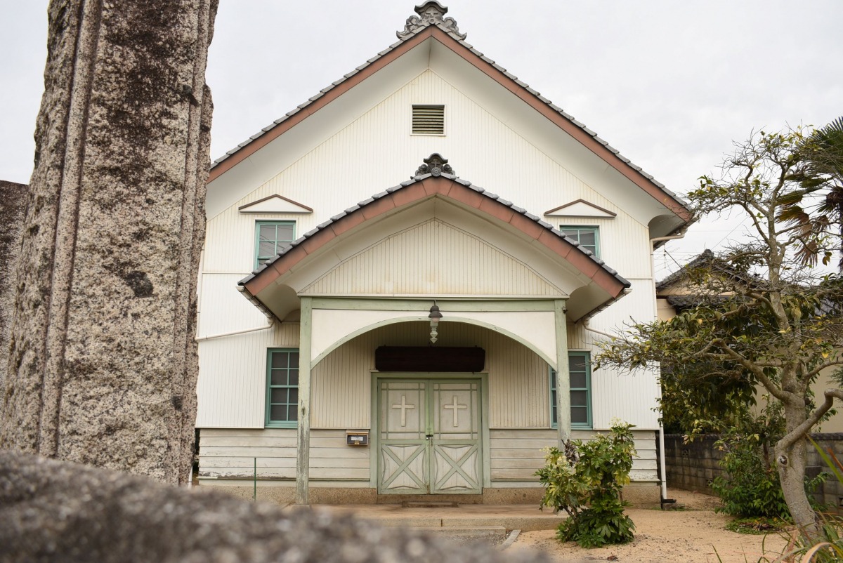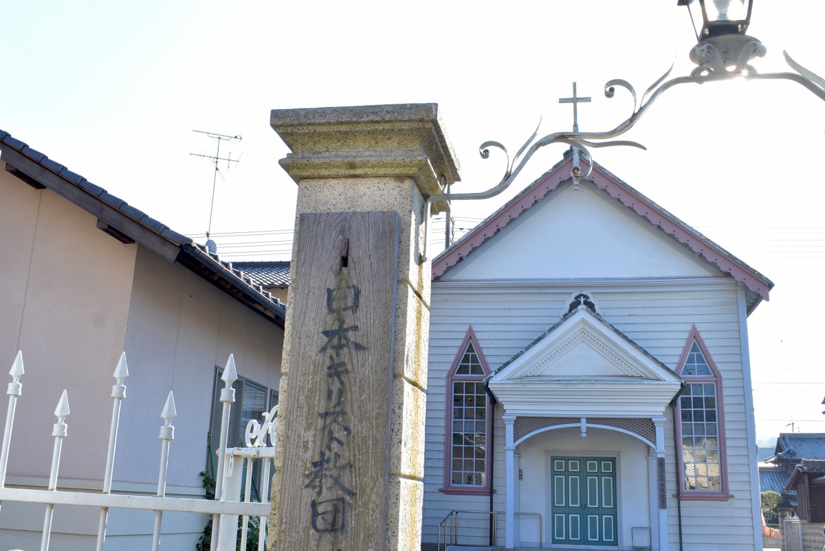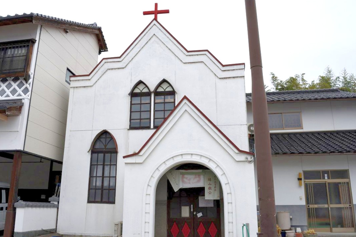三層になった高い塔屋に、直角に突き出た壁(バットレス)。一度見たら忘れられない個性的なデザインの教会です!津山にある国登録有形文化財・森本慶三記念館と同じく、クリスチャン棟梁の桜庭駒五郎が手がけた建物なんだとか。鷹取醤油や馬場商店など、発酵文化の香りもただよう旧山陽道の風情も楽しめますよ。