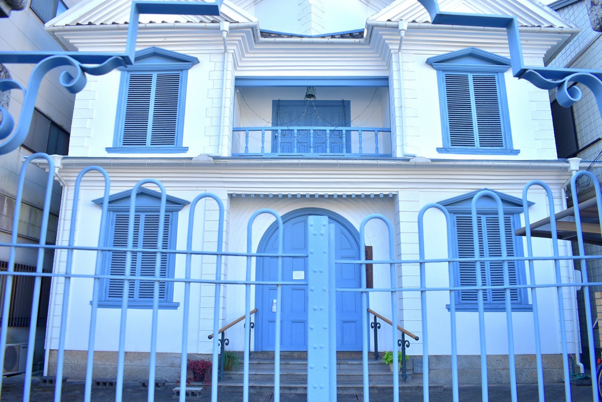 何気ない通りの一角に、爽やかすぎる海町カラーの擬洋風建築が!明治時代に水色×ホワイトの色合い。さぞかし目を引いたことでしょう。シンメトリーの建物に、角度の付いた塔屋。不思議な立体感を感じさせるコーニス(軒下の蛇腹)など。端々まで装飾がほどこされています。