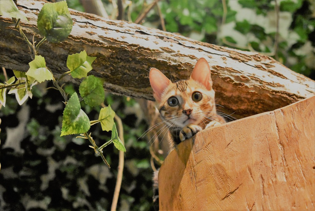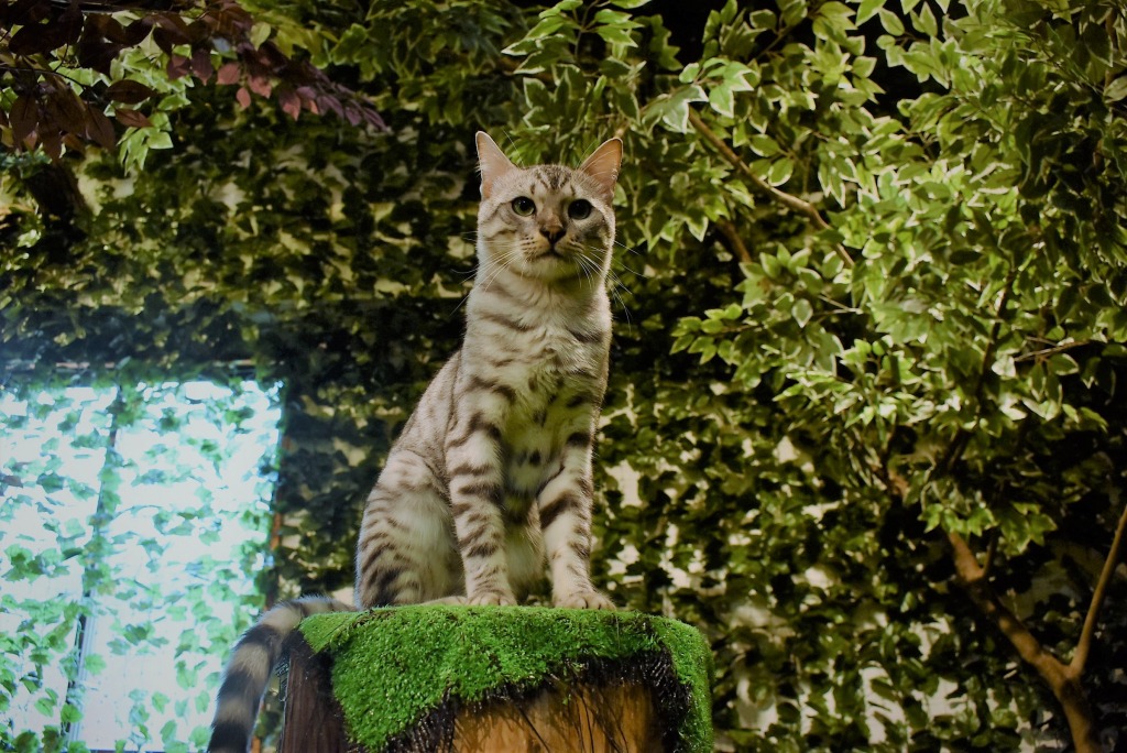 天井まで張り巡らされたキャットタワー。自然を模したワイルドな室内を縦横無尽にかけ回るヒョウ猫(ベンガル猫)たち。元気で好奇心旺盛な猫とたっぷり触れあえます。