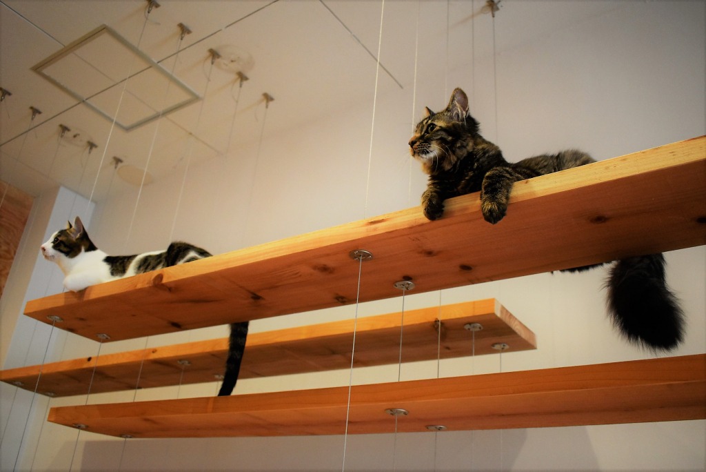 ユラユラする長い板も元気な猫たちの遊び場です!窓辺で日向ぼっこしたり人用クッションを占領したり!猫らしくあれるよう作られた空間です。ガラスで仕切られたカフェから眺めるだけでも楽しめます。コーヒーに肉球マシュマロを浮かべて!