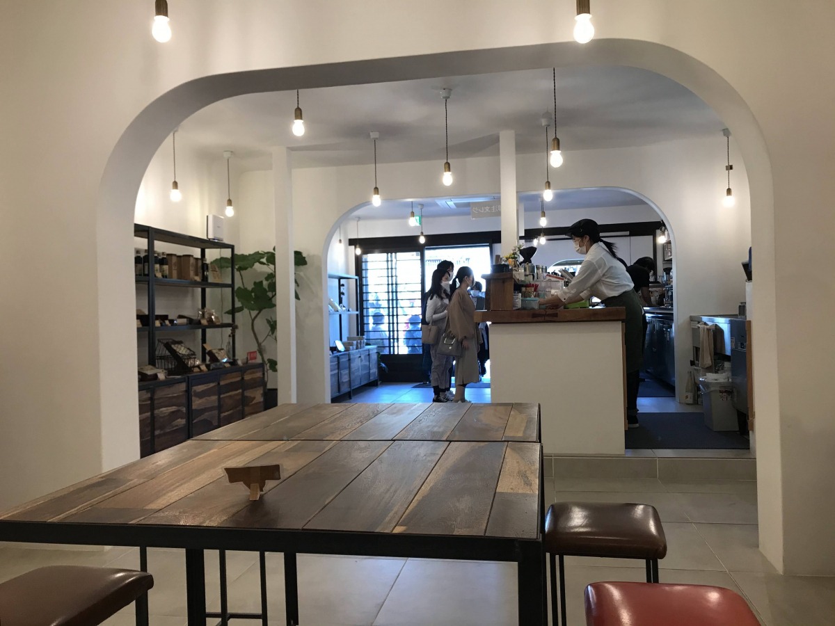 ここでは、備前銘菓 大手まんぢゅうや自家焙煎珈琲、大手まんぢゅうのあんこをアレンジした甘味が味わえます。カウンターでメニューを選び、奥の席へと進みます。