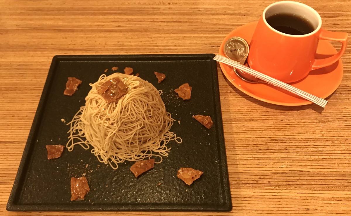 伝わるでしょうか、コーヒーカップに負けないこの大きさが。香り高く、風味豊かなモンブランクリームがたっぷり! サクサク香ばしいフロランタンに、モンブランの底にもサクサクのメレンゲ。サクッ、とろっ、ふわっ、サクッ……次々に変わる食感を楽しめます。甘さ控えめ、フロランタンのほろ苦さが大人の味わいです。