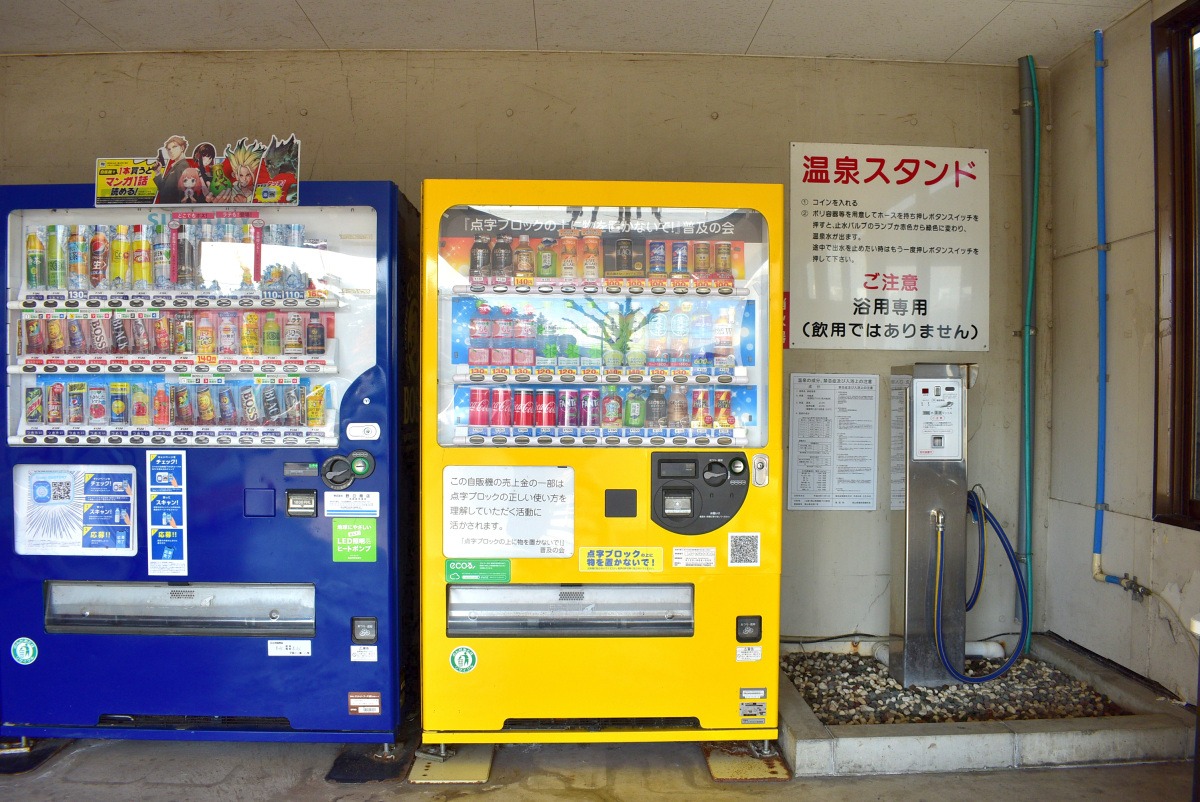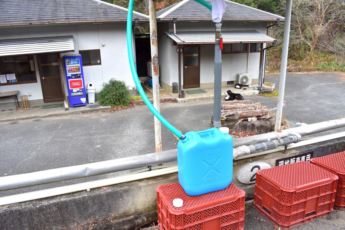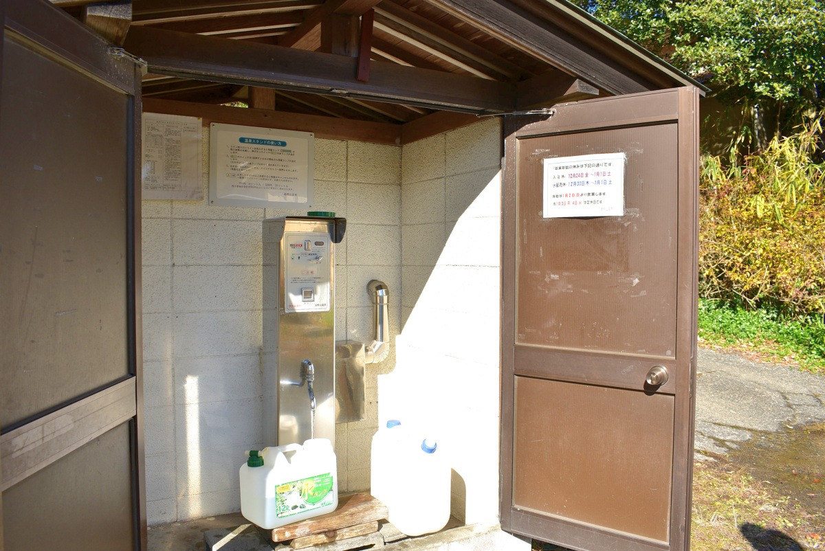 「私も自動販売機です」と誇らしげに、ベンダーショップに並ぶこちらの温泉スタンド。アルカリ成分高めの温泉水(低張性性アルカリ性)が、20リットル100円で購入できちゃいますよ。だいたい基本的なサイズのポリタンク1つが18リットル程なので、余った水でタンクの中を予洗してから注入すると、もうおウチ温泉のベテランかも!?