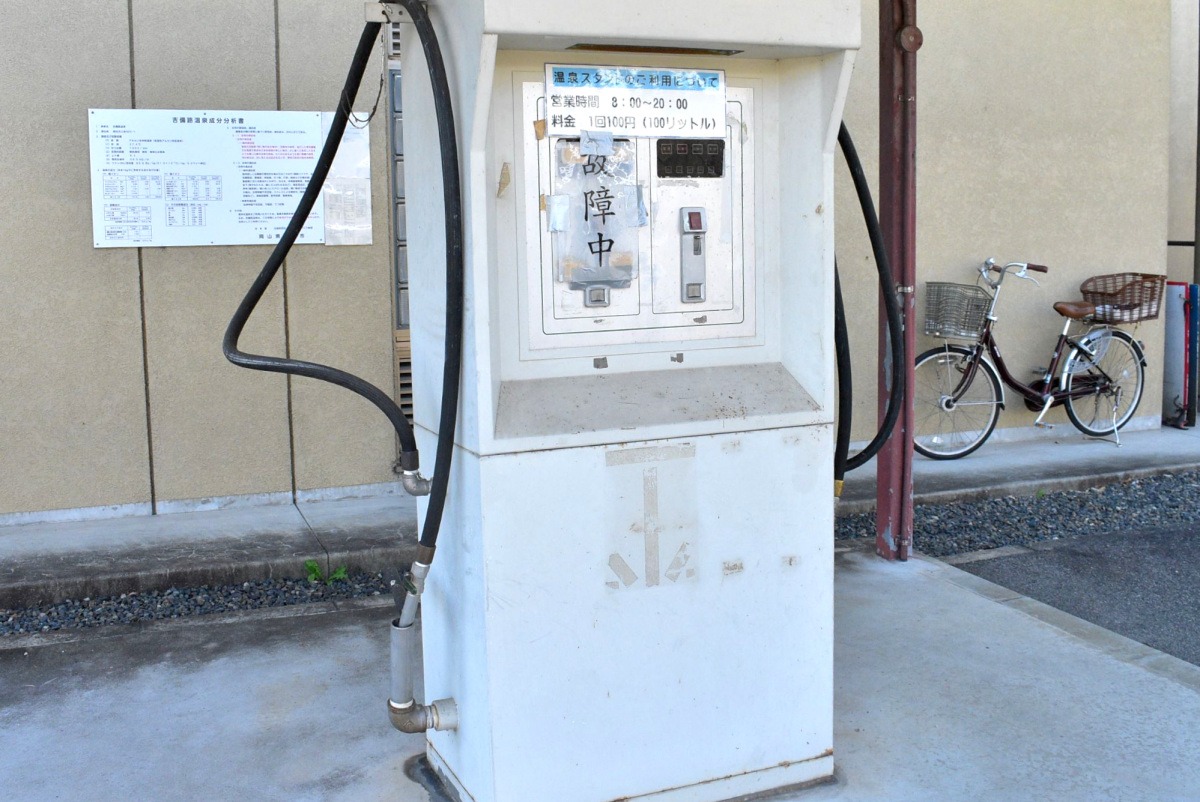 えっ。ガソリンスタンド!?いえいえ、こちらは国民宿舎サンロード吉備路の北側に設置されている、正真正銘の温泉スタンドです。しかも料金も驚きの100リットル100円!
