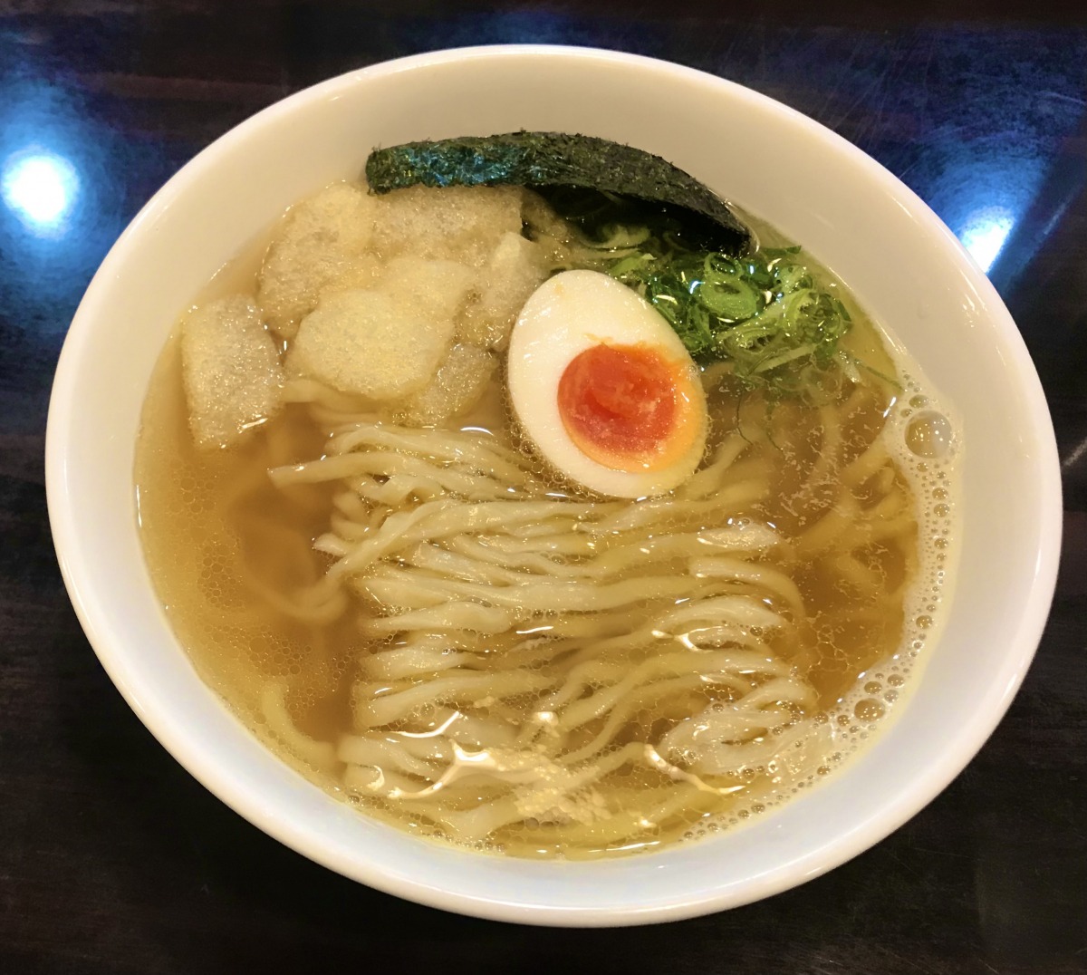 煮干の香ばしい風味が溶け込んだスープは、透明感があり洗練された味わい。朝焼けの空にたゆたう雲のように、輝くような黄金色のスープにふんわりと色白の油揚げが添えられています。塩味のスープに、海苔、ねぎ、味玉と具材もヘルシー。朝の煮干そばは、他の時間帯よりも少しだけ塩味を濃いめにしているそう。まだ眠い身体に沁みわたる熱々のスープで、すっきり目が覚めました。